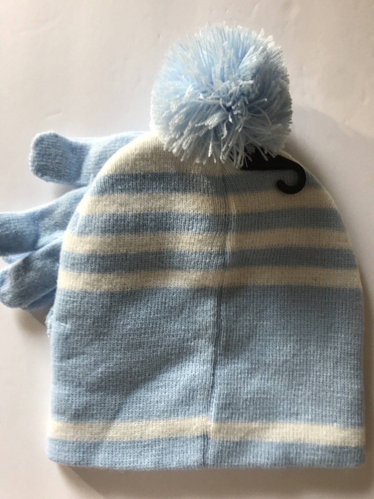 Disney FROZEN Toboggan Winter Hat Glove Set Icy Blue Stripe PomPom ANNA/ELSA NWT