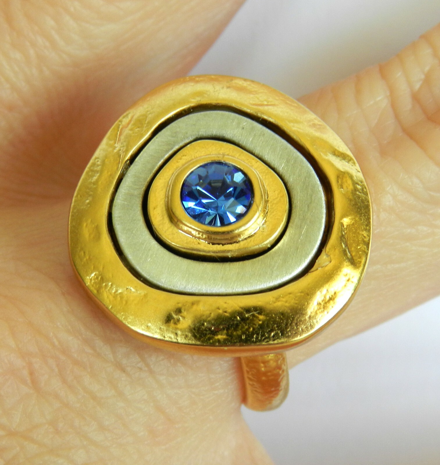 Art Designer Silver 925 Gold 24K Plated 3 Circles Abstract Ring Blue Stone Sz 8