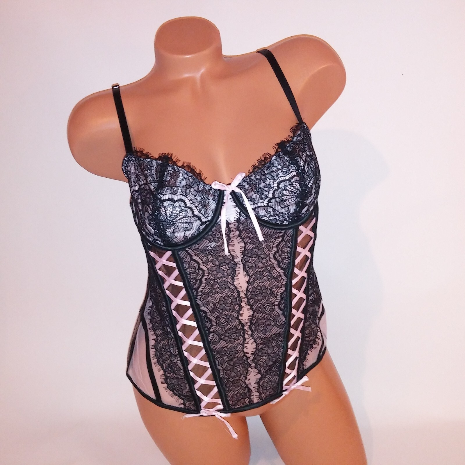 как выглядит Victoria Secret Lingerie Bustier Corset Large Black Pink Lace Sheer Hook Eye фото
