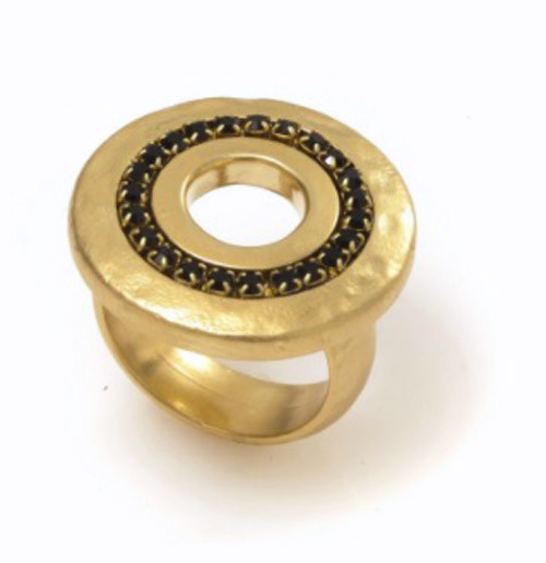 Designer Yellow Gold 24K Plated Round Hole Disc Ring Black Stones Swarovski Sz 8