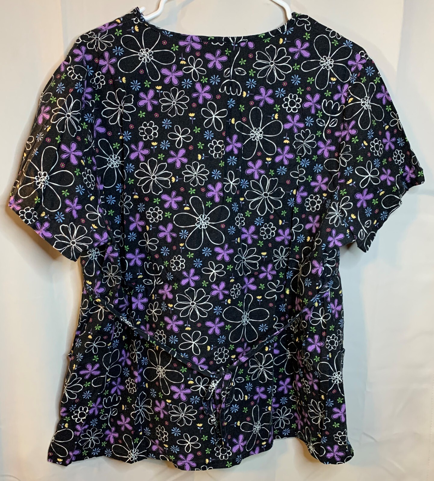 как выглядит Womens Comfy Cotton Size L - Black Short Sleeve Purple Flowers Scrub Top фото