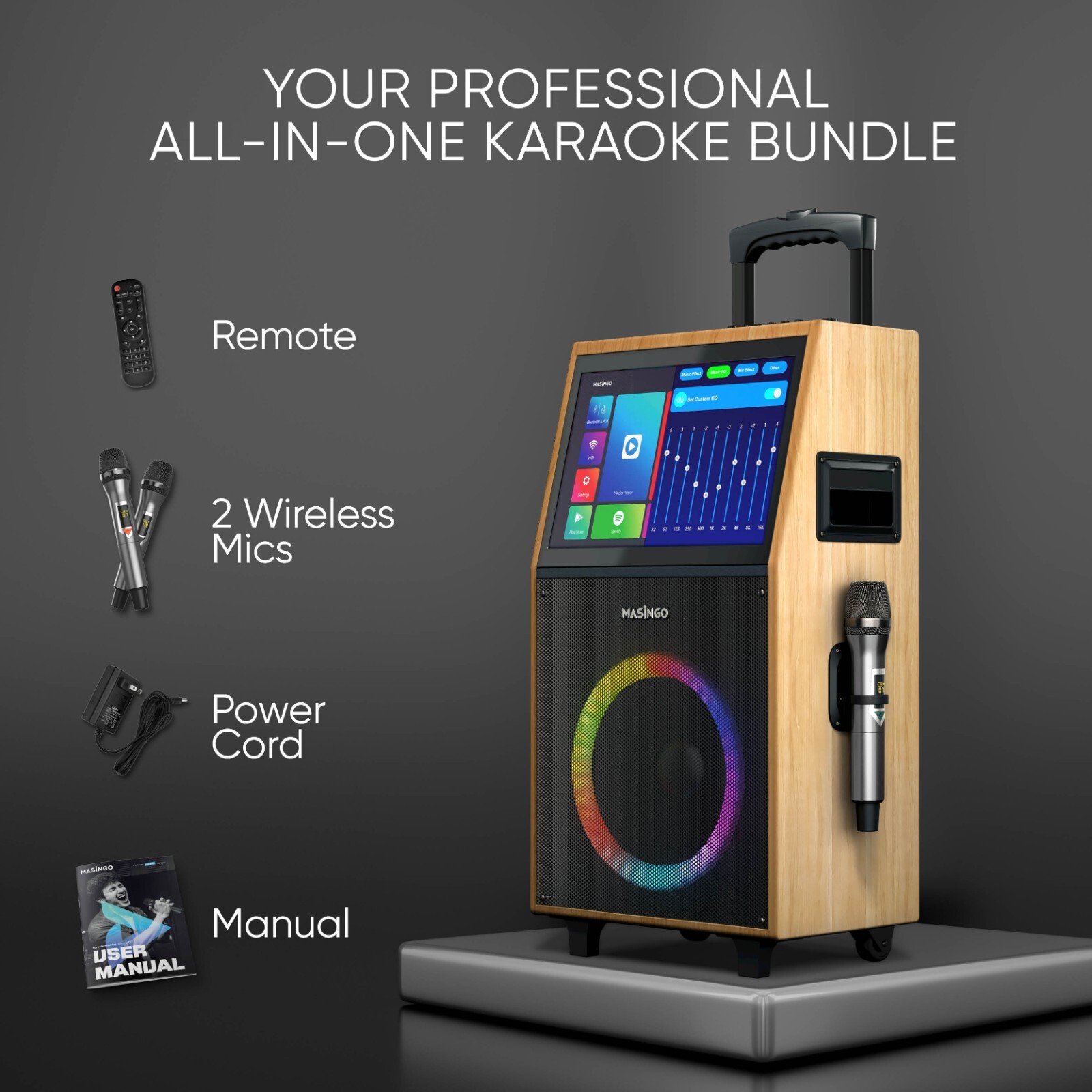 MASINGO Karaoke Machine with Built-in 15 Tablet, LED Lights, 2 Wireless Mics