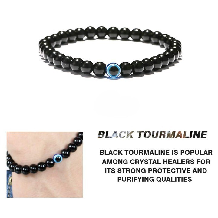 как выглядит Black Tourmaline Natural Healing Stone Evil Eye Charm Gemstone Bracelet 6mm фото