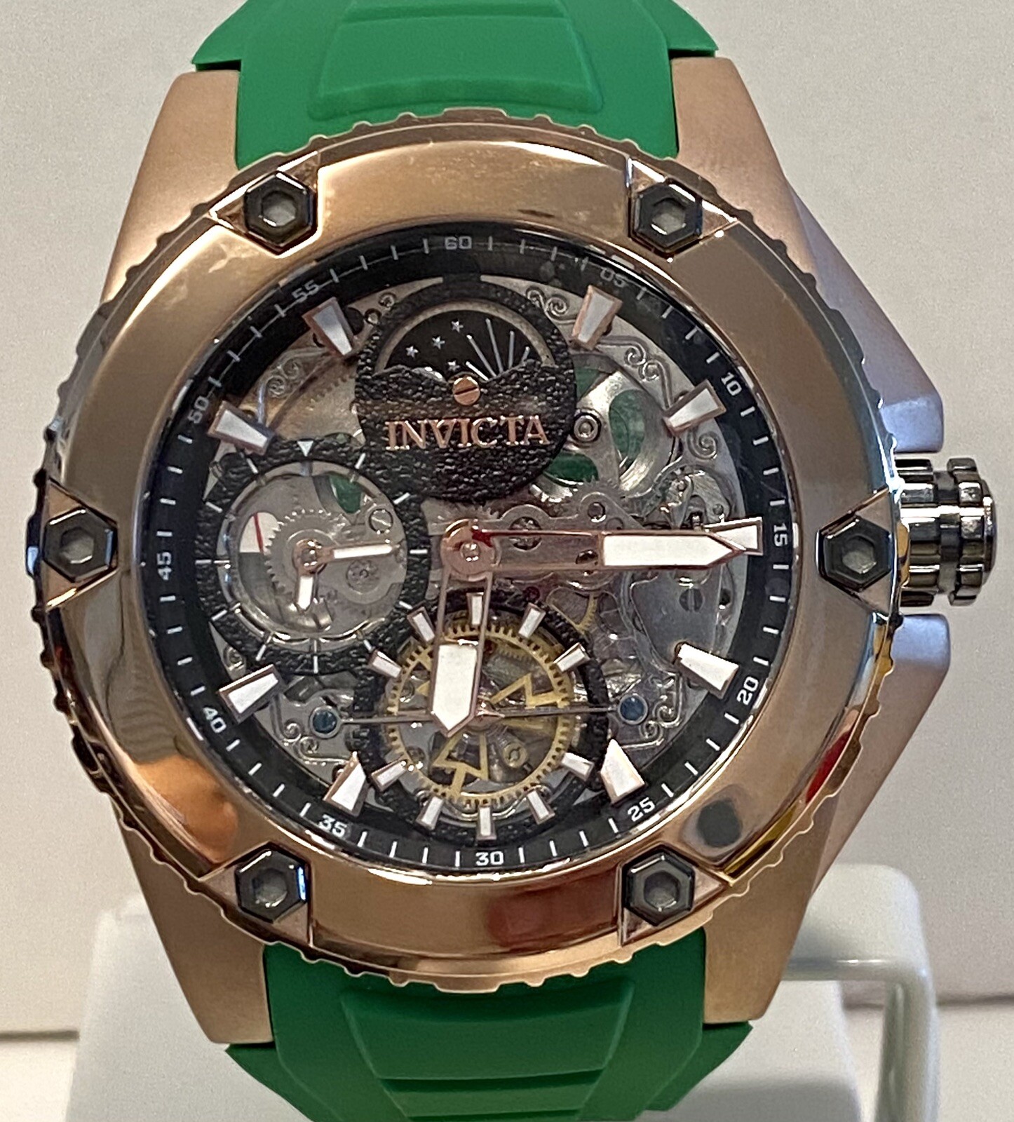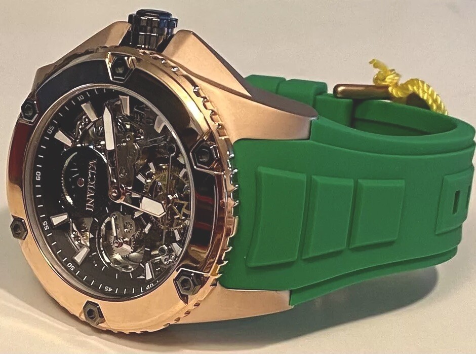 как выглядит 51mm Auto Skeleton Rosetn Green Band Day/Night DUAL TIME Akula Invicta Watch фото