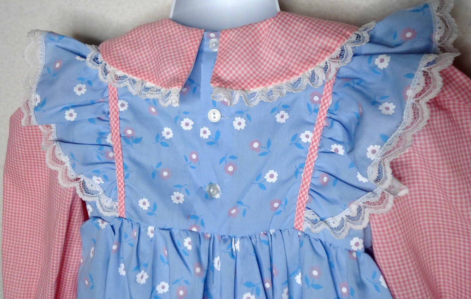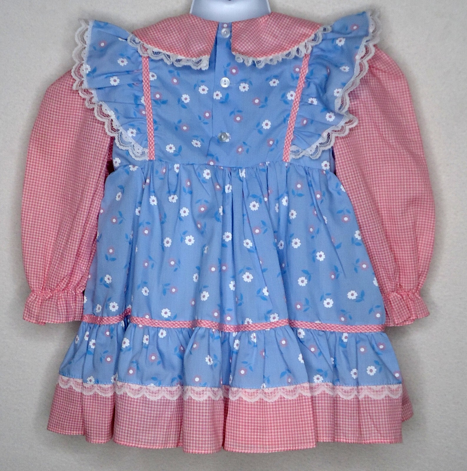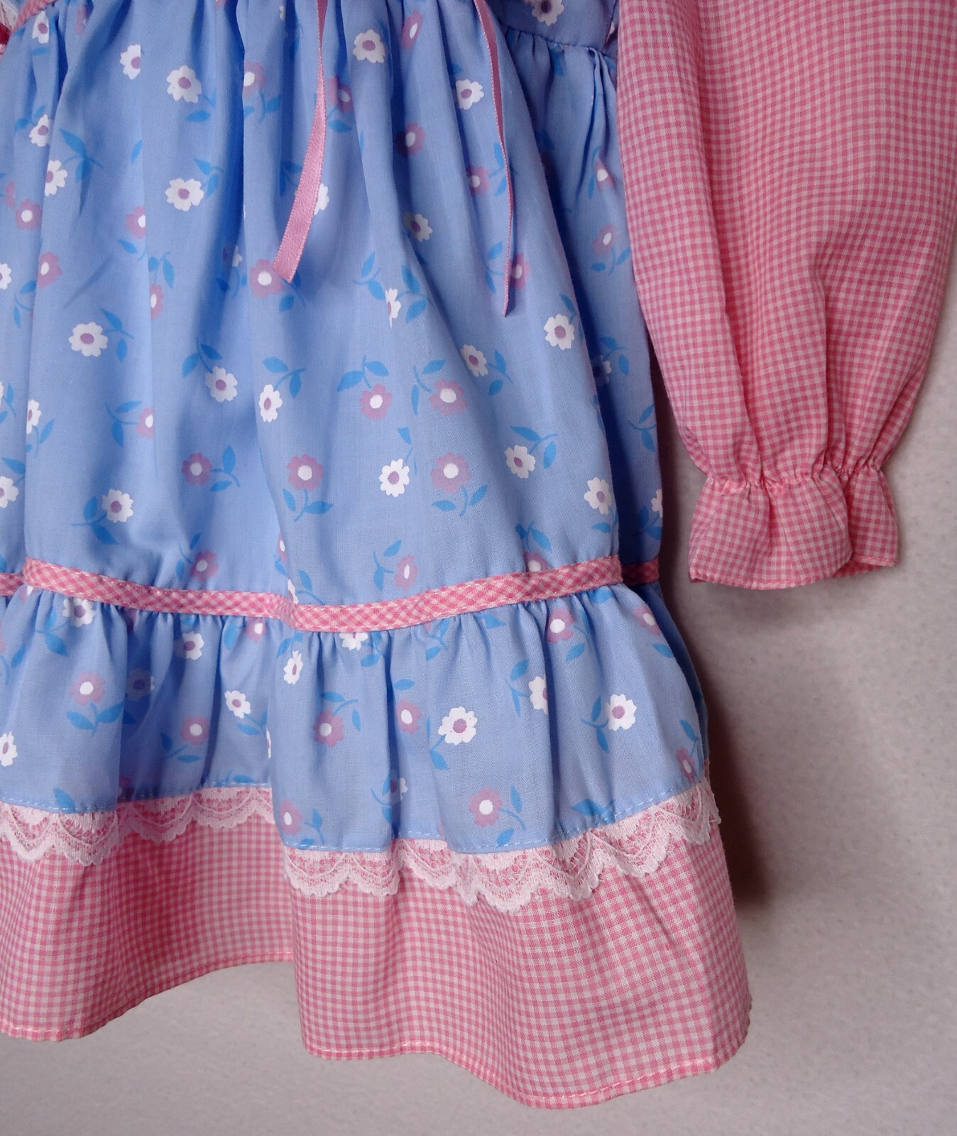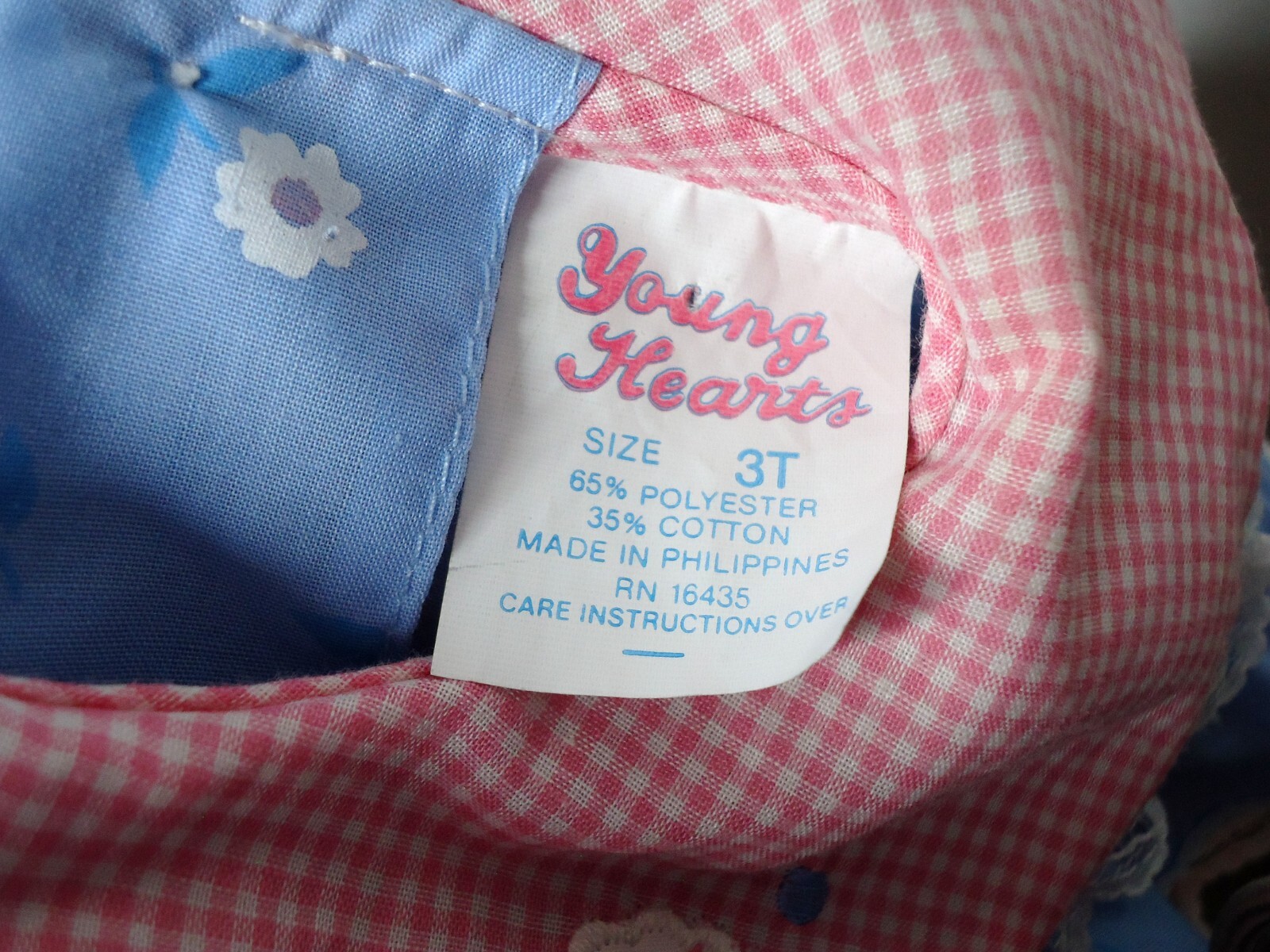 Vintage Young Hearts Dress 3T Girls Floral Gingham Ruffle Pinafore Pink Blue