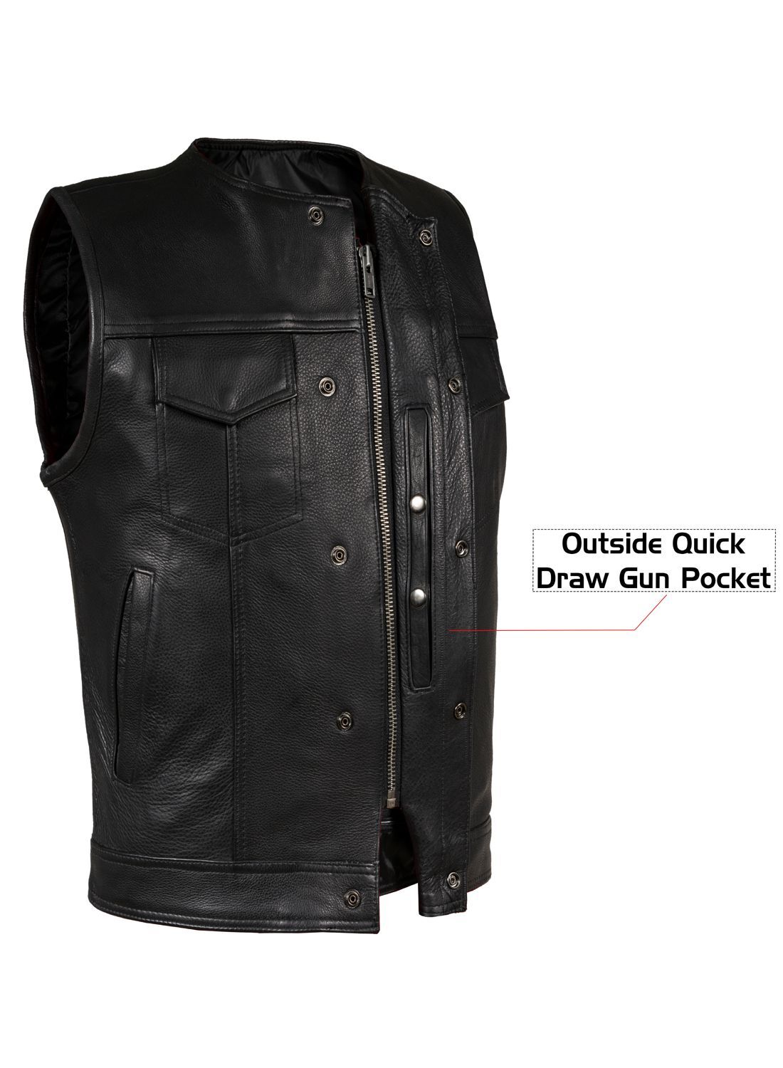 Men's Black Leather Vest SOA Motorcycle Concealed Collarless Custom Waistcoat