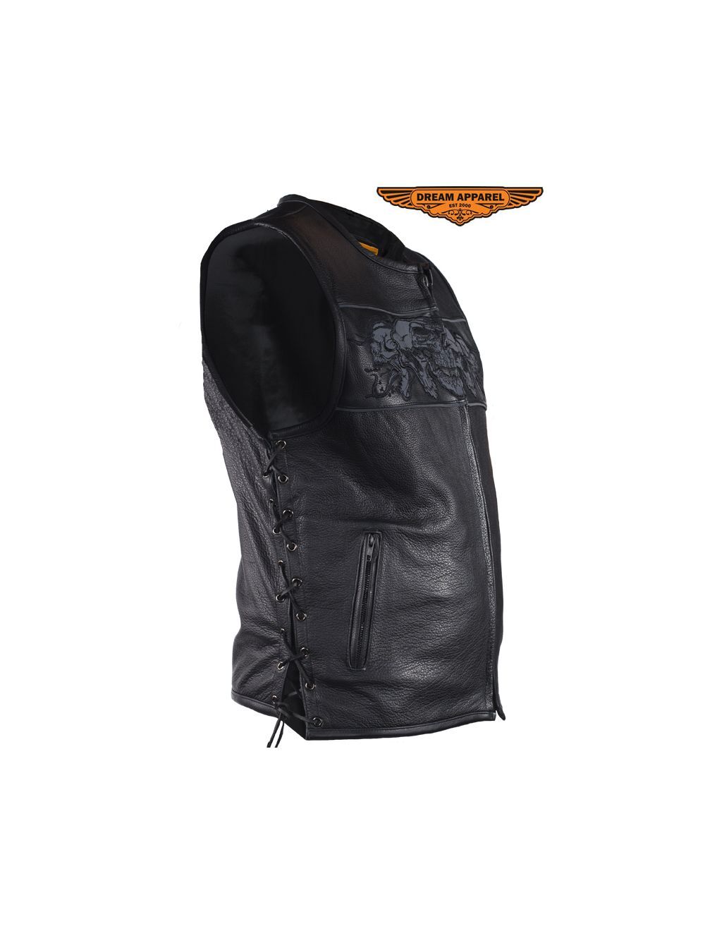 как выглядит Mens Black Leather SOA Vest Motorcycle Concealed Reflective Skulls Waistcoat фото