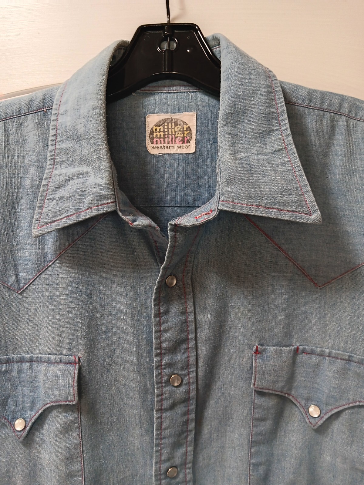 Vtg 70s 80s Miller Western Wear Mens Pearl Snap Shirt Sz 17 34 Blue Red Stitch