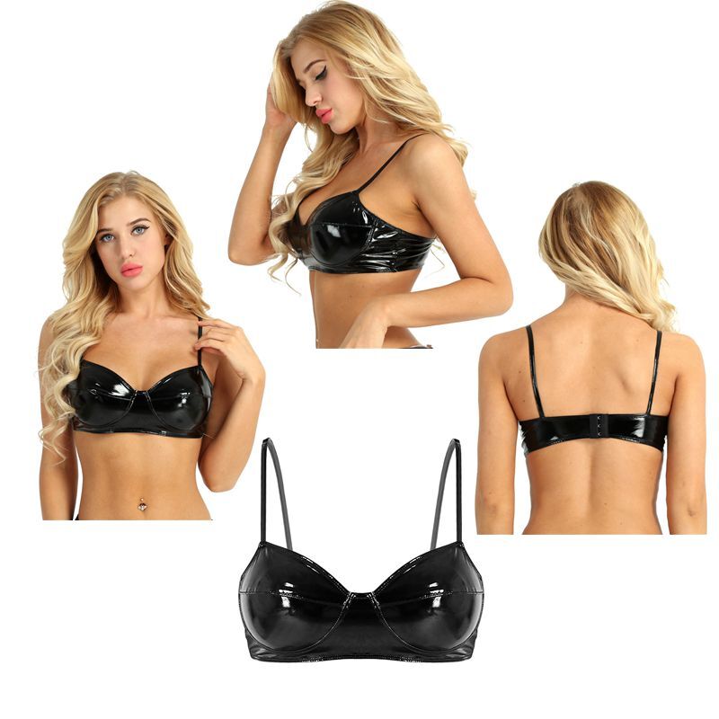 как выглядит US Womens Wet Look Faux Leather Bra Wirefree No Padded Bralette Bustier Clubwear фото