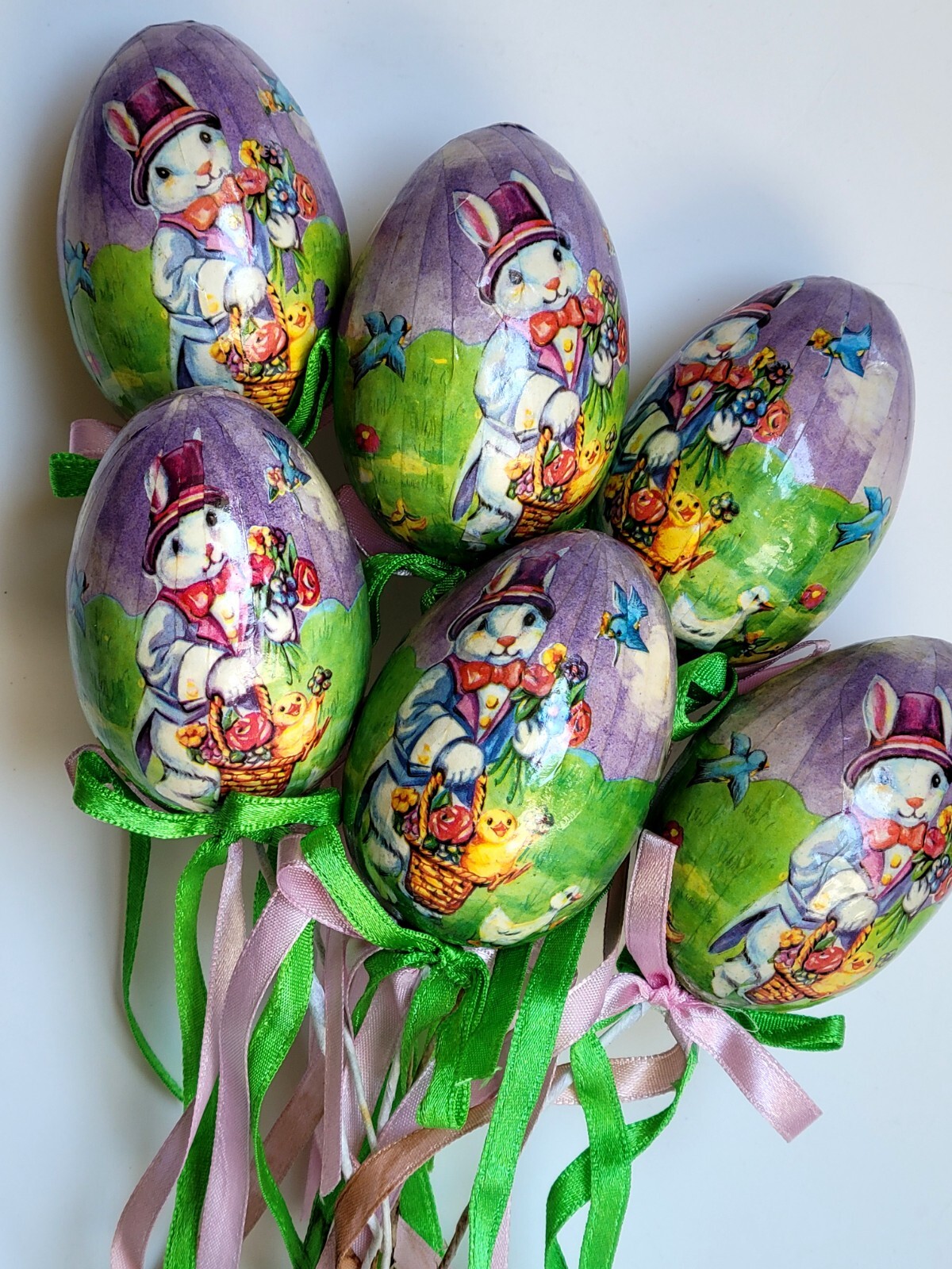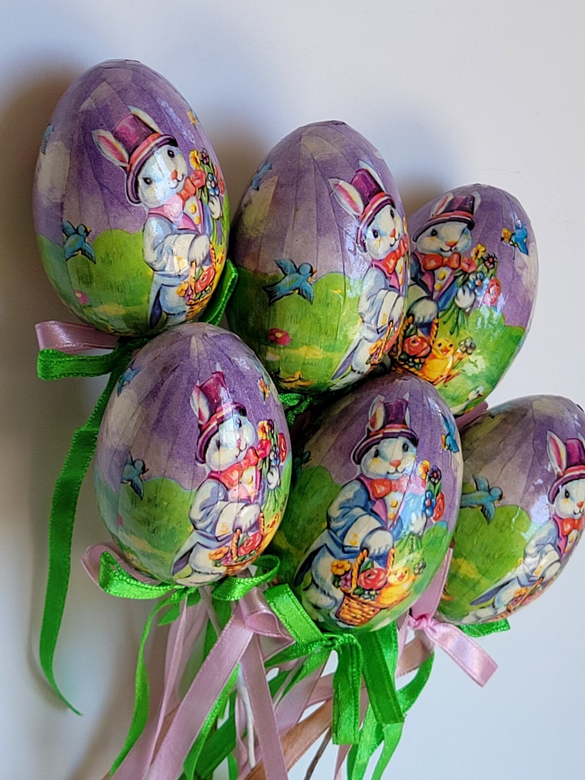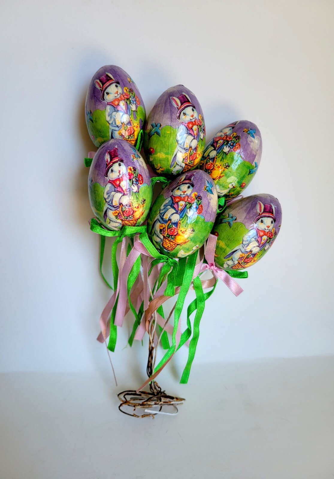 Vintage 6 Piece Set Foam Easter Egg Decoupage Wire Stick Holiday Bunny Decor