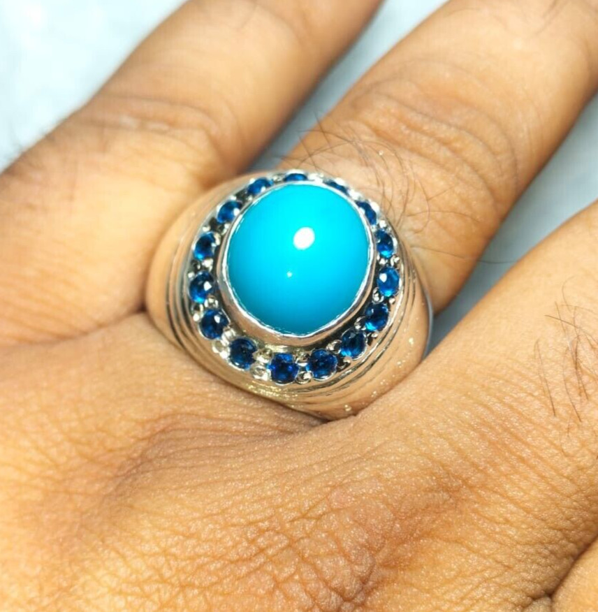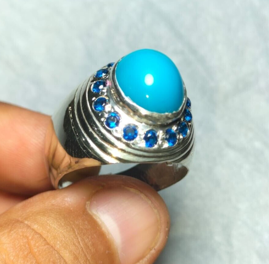 Beautiful Natural Blue Turquoise Stone Ring With Blue Zircons Around Feroza 925