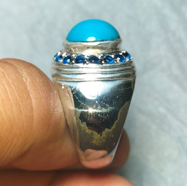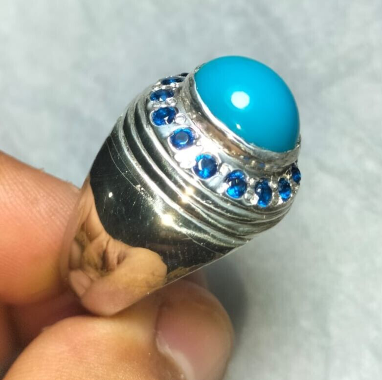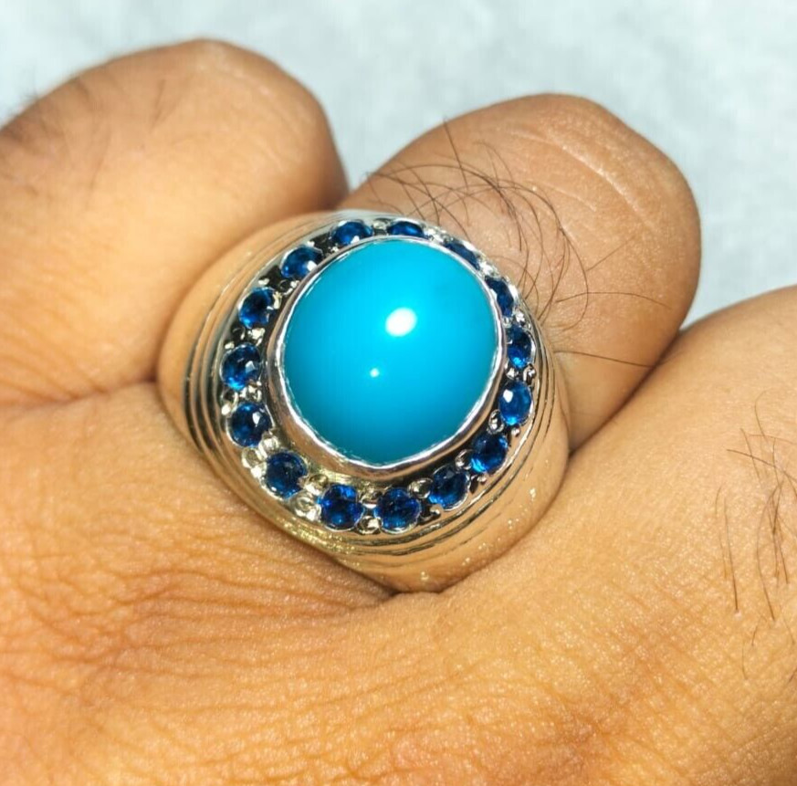 как выглядит Beautiful Natural Blue Turquoise Stone Ring With Blue Zircons Around Feroza 925 фото