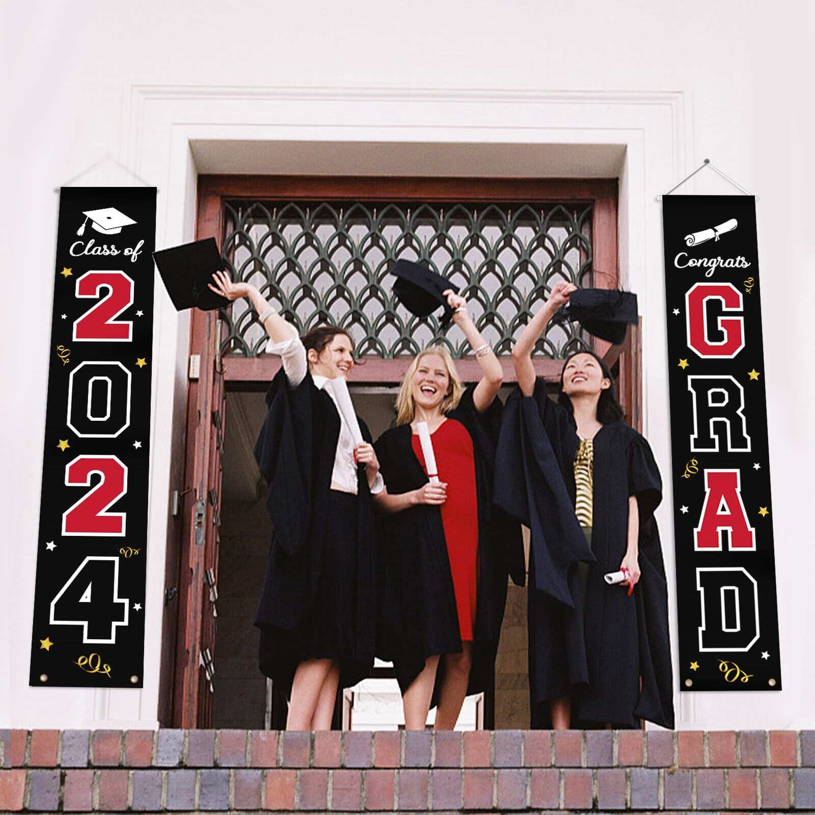 как выглядит 2024 Graduation Banner Decorations - Porch Sign Set Red White Black Welcome D... фото