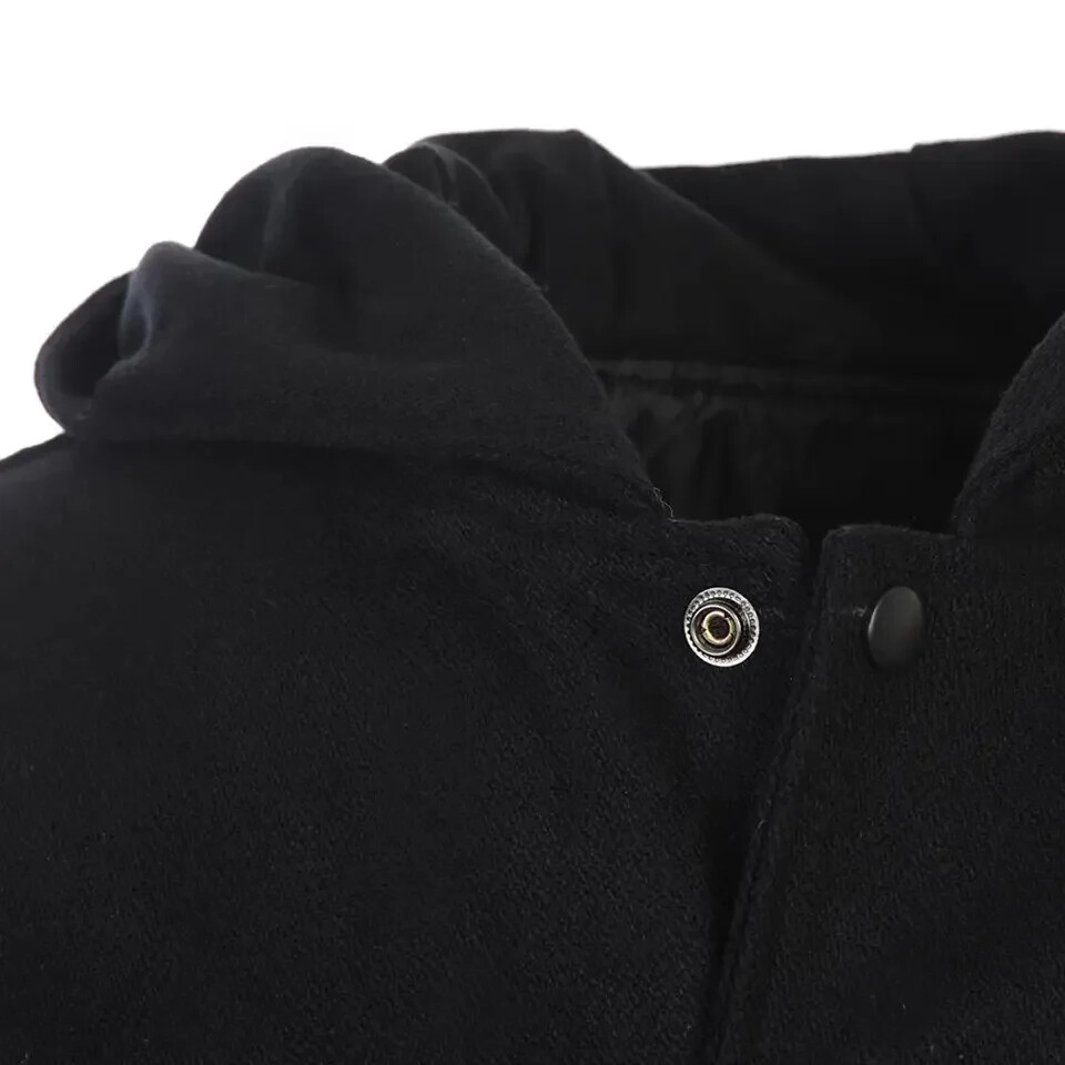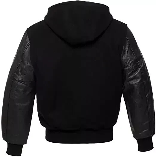 Letterman Baseball Varsity Jacket Hoodie Black Wool and Black Leather Sleeves
