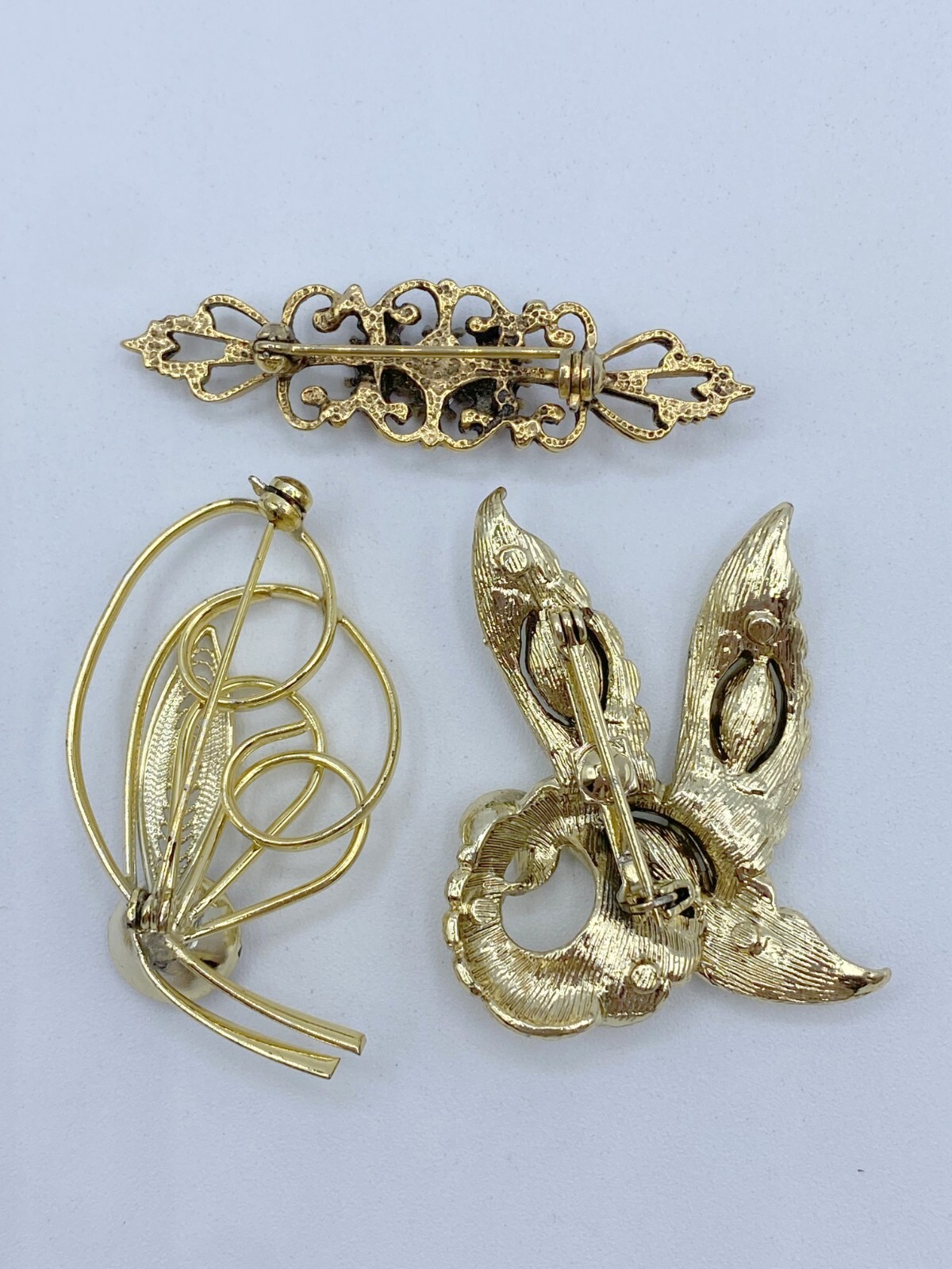 как выглядит E2-3853 LOT OF 3 VINTAGE BROOCH GOLD TONE PIN RHINESTONE VICTORIAN FLORAL фото