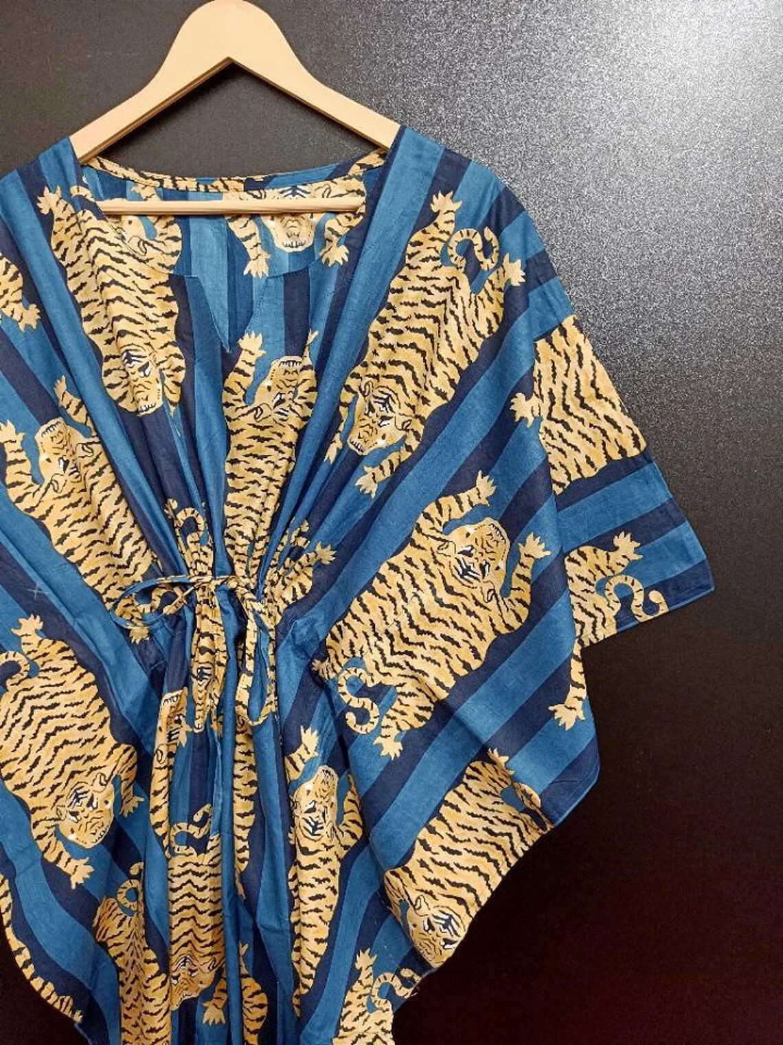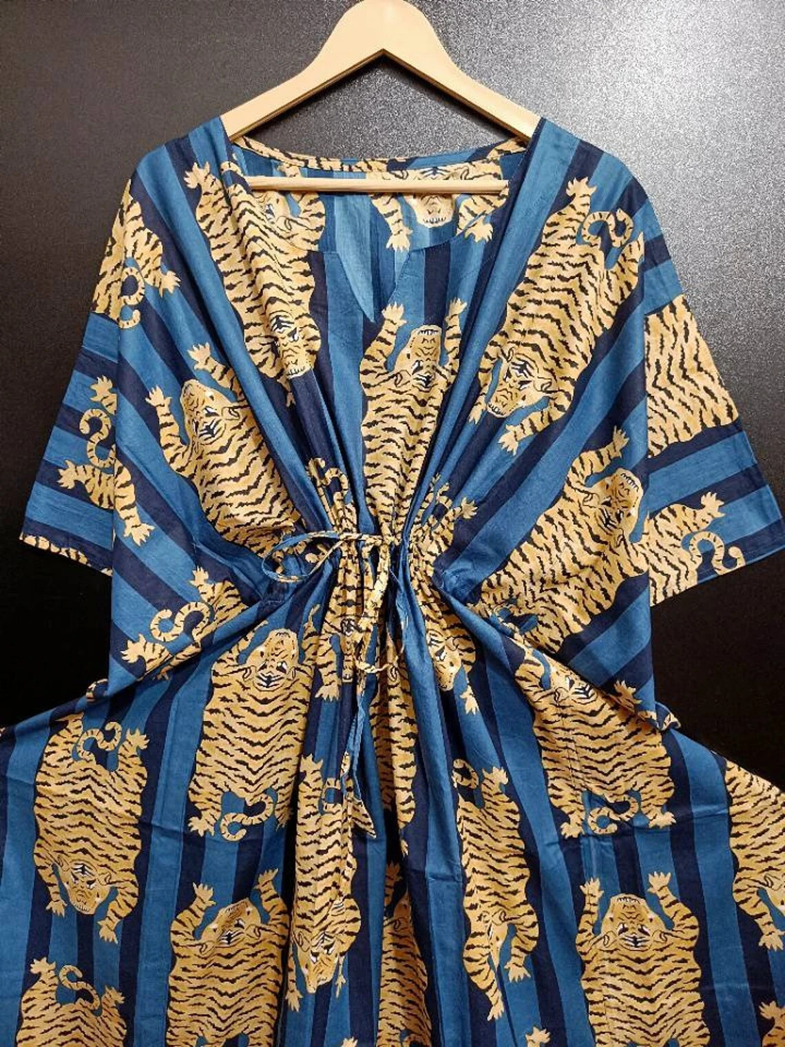 Indian Blue Tiger Printed Cotton Hippie Maxi Women Nightwear Caftan Dress