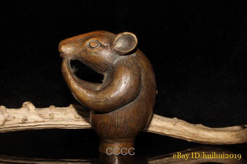 как выглядит Chinese Rare Retro Bronze Zodiac Rat Cane Walking Stick Head Handle Accessories фото