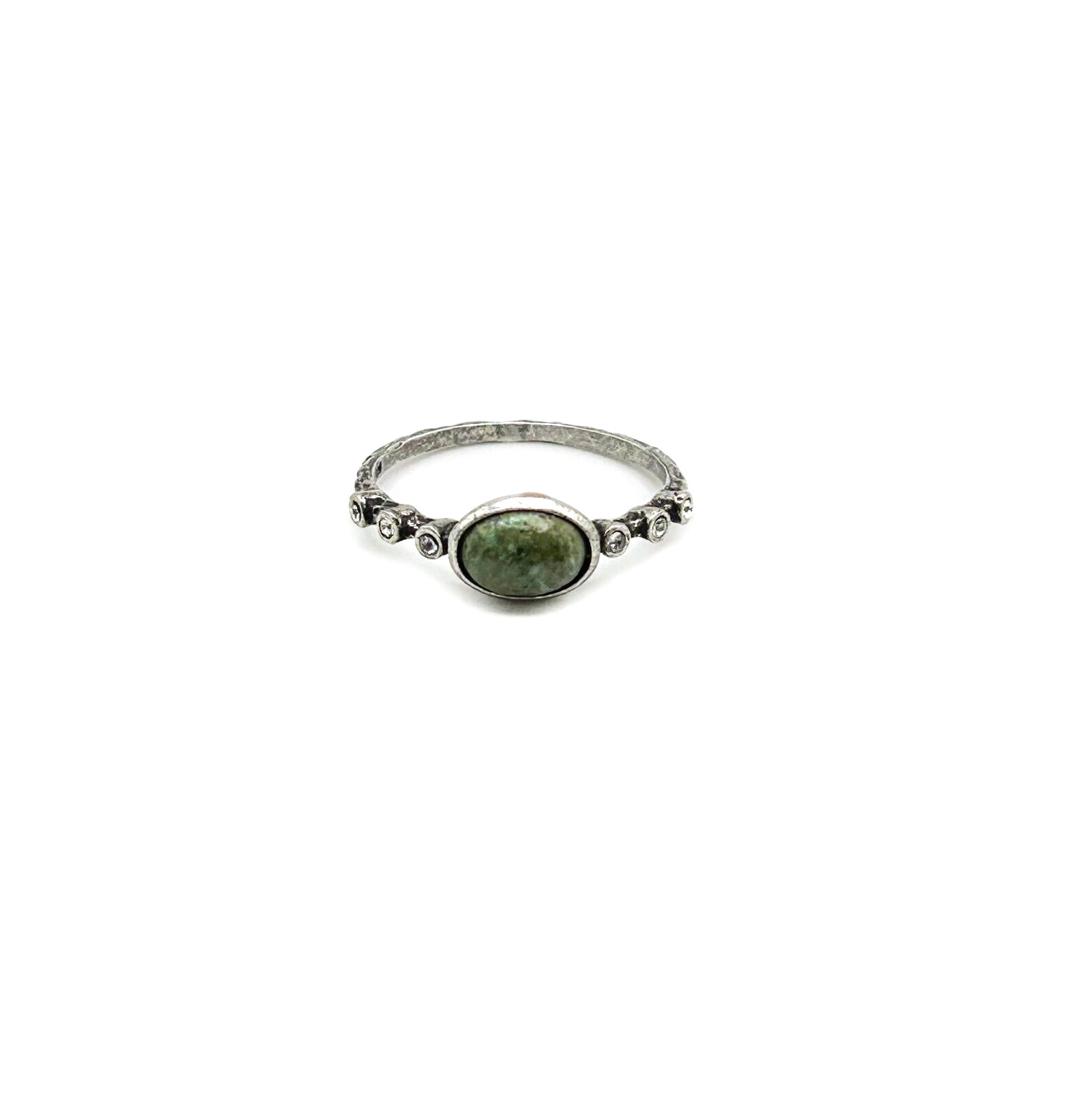 Sterling Silver 925 Ring w/ Central Green Stone Clear Gems, Size 7.5-8