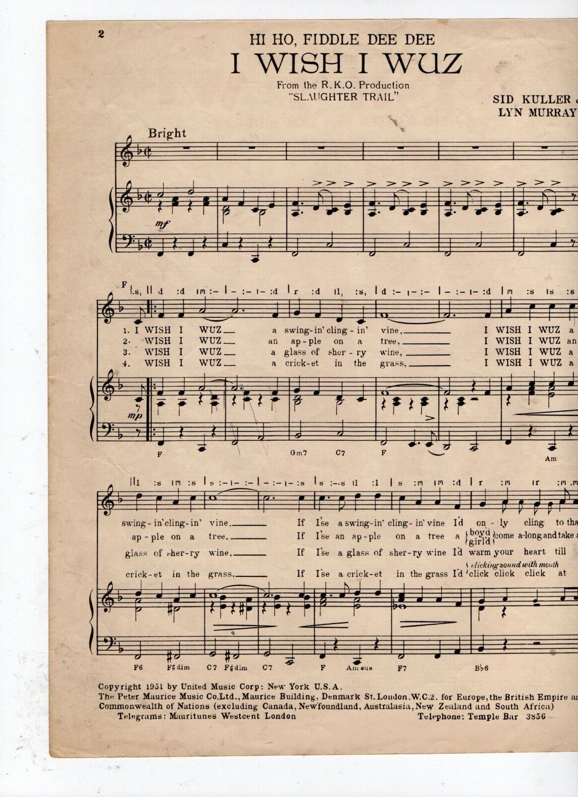 Art Lund - I Wish I Wuz Sheet Music 1951