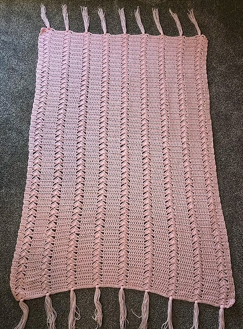 Hand Crocheted Pretty Pink Soft Fringed Crocheted Girl Baby Blanket 53x 41