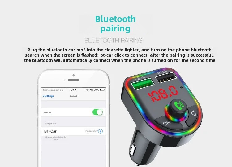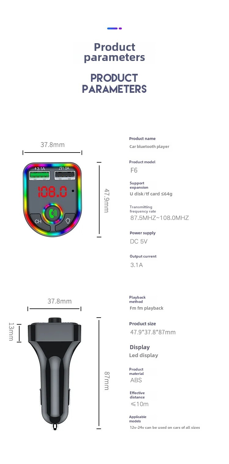 Car Bluetooth Mp3 Player F6 5.0 Chip USB/TF Card Slot Instant Music Playback