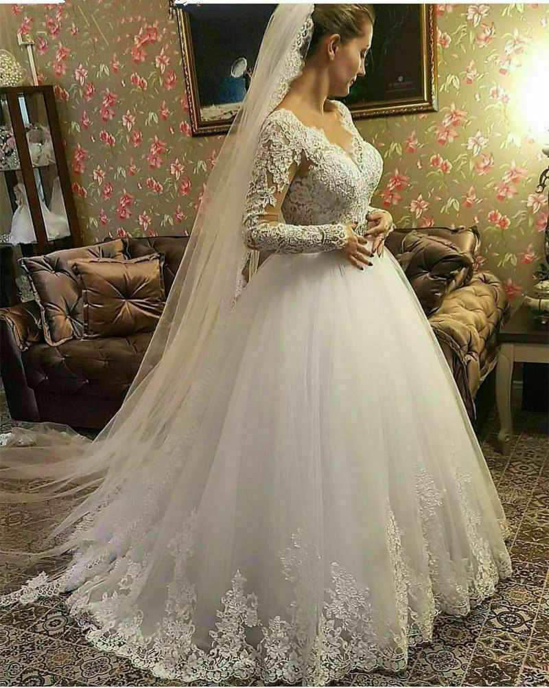 как выглядит Plus Size V Neck Wedding Dresses Lace Applique Long Sleeves A-line Bridal Gowns фото