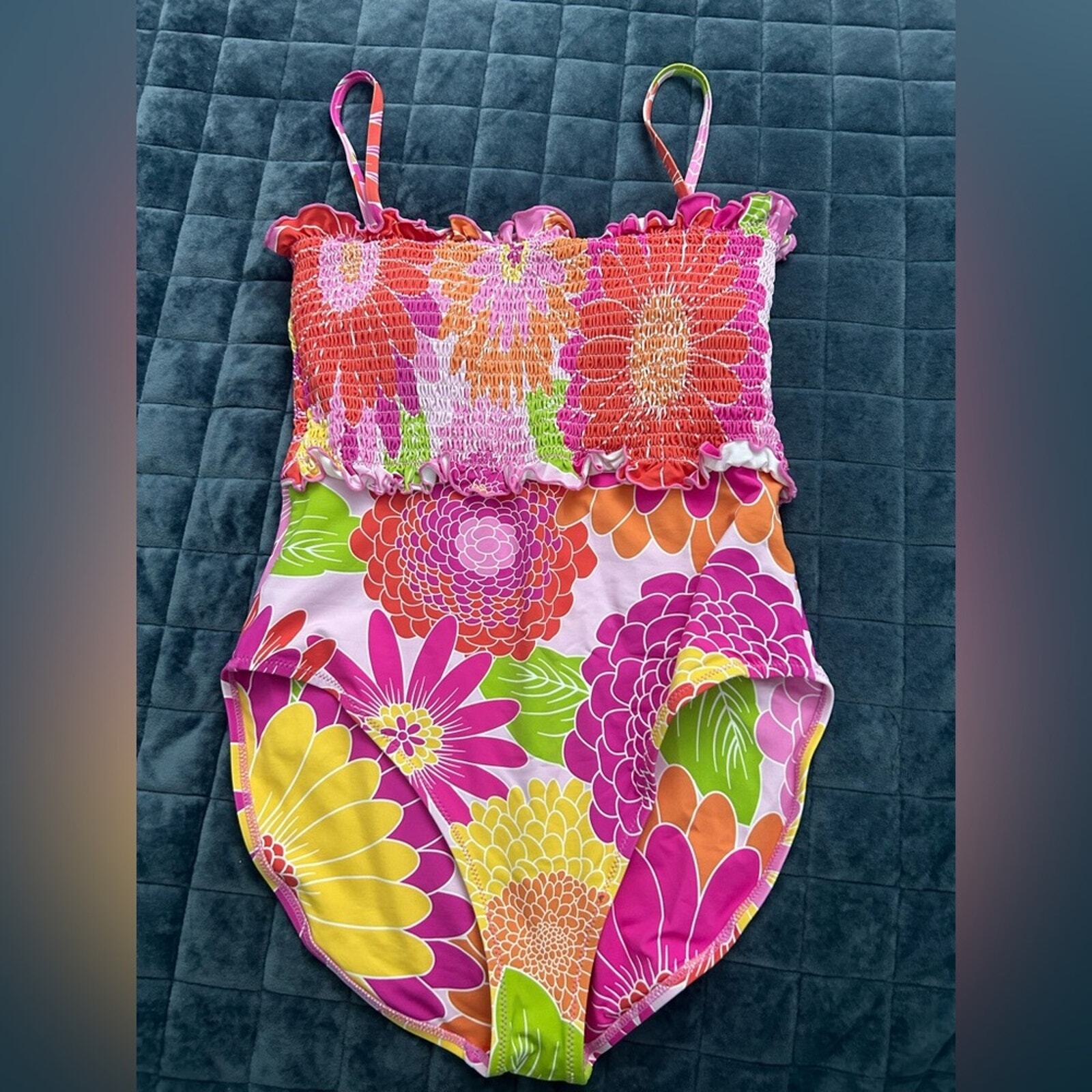 как выглядит J.Marie Floral Print Smocked Ruffle Waist One Piece Swimsuit фото