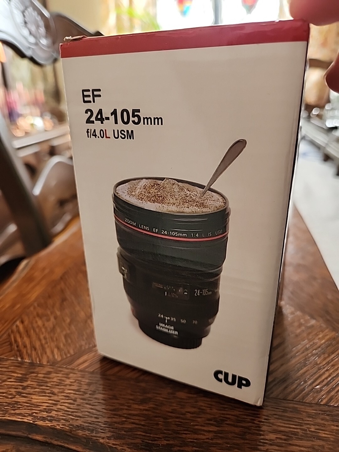 • NEW Camera Lens Travel Cup Like Canon EF 24-105mm Photographer Mug w/Lid Spoon