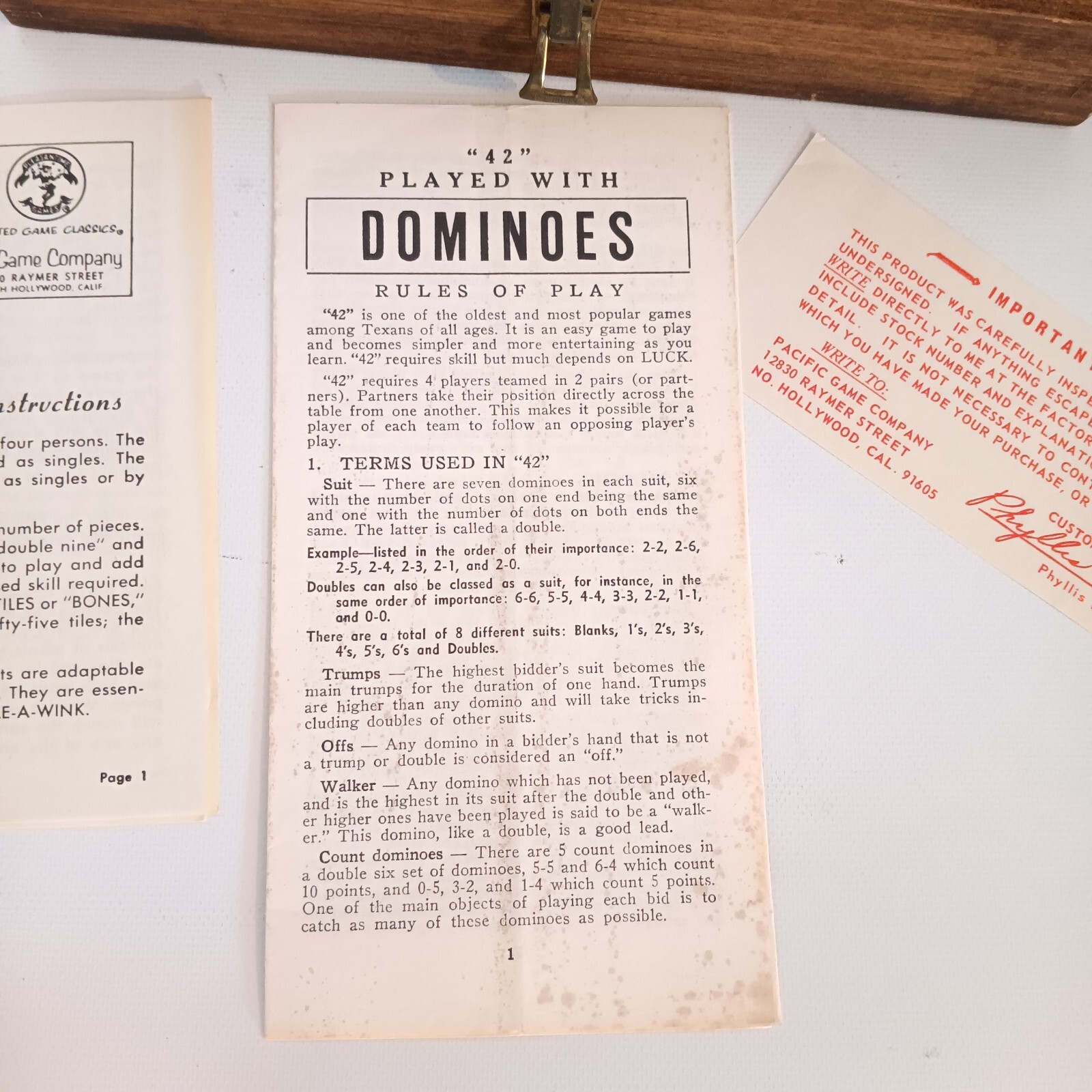 Vintage 28 Piece Domino Set In Walnut Wood Box Pacific Game Company With Papers