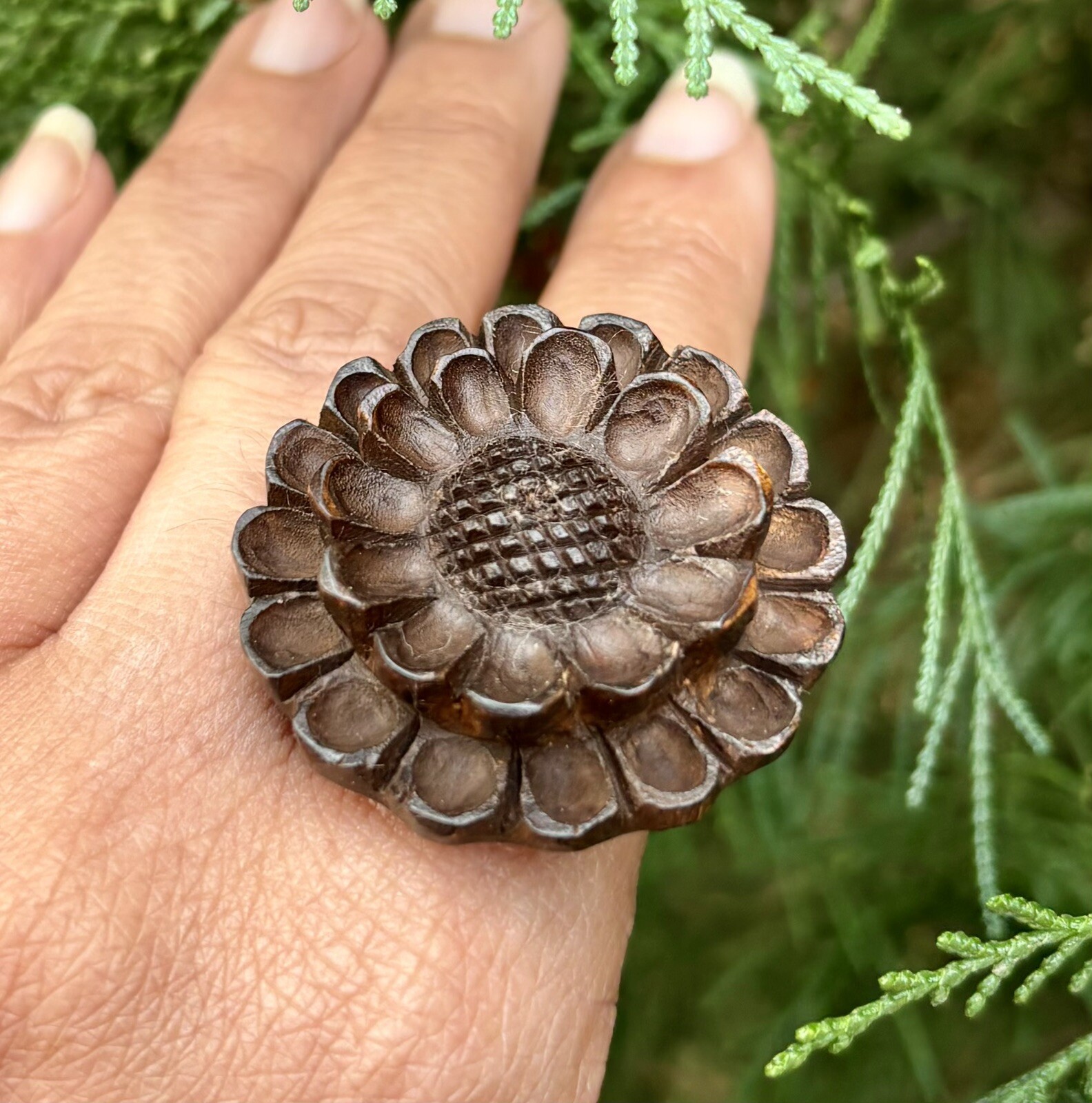 Kadamb Wood Flower Carved Handmade Statement Ring, US 8.5 Ring Size, Floral Ring