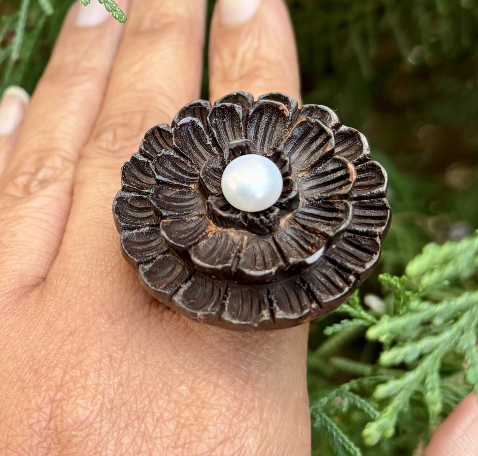 Kadamb Wood Pearl Carved Flower Floral Handmade Ring, US 9.5 Ring Size