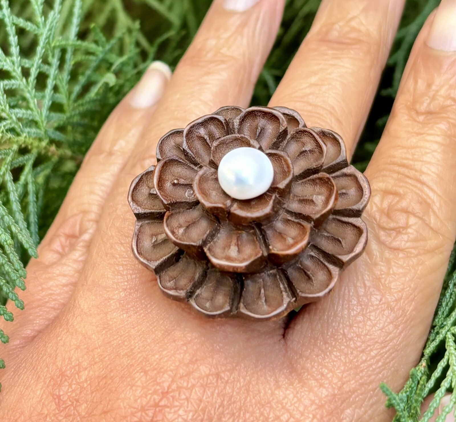 Kadamb Wood Pearl Carved Flower Floral Handmade Ring, US 8 Ring Size
