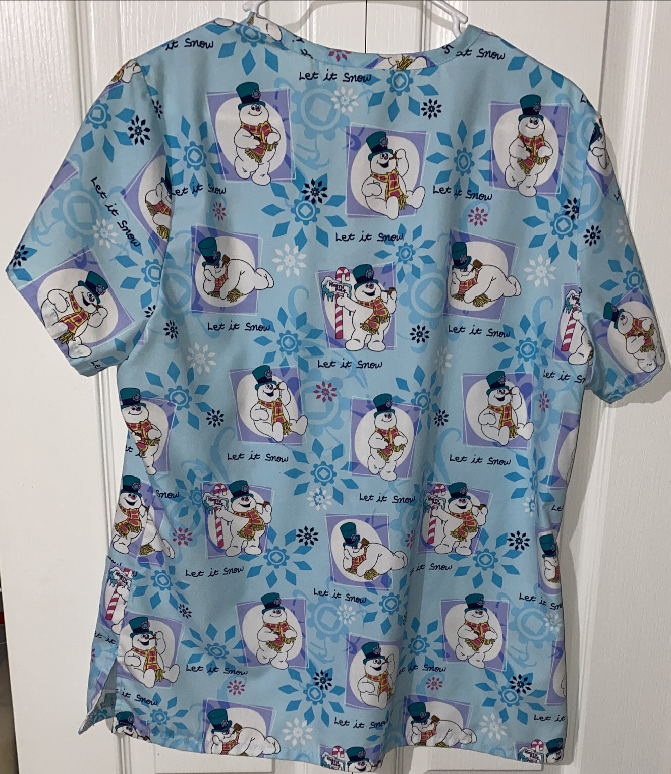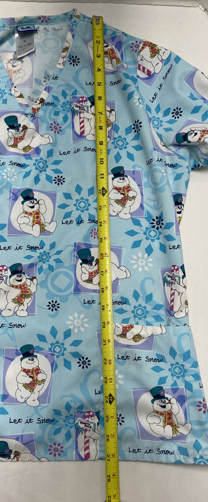 Christmas Scrub Top womens size Medium Frosty the Snowman Let it snow blue