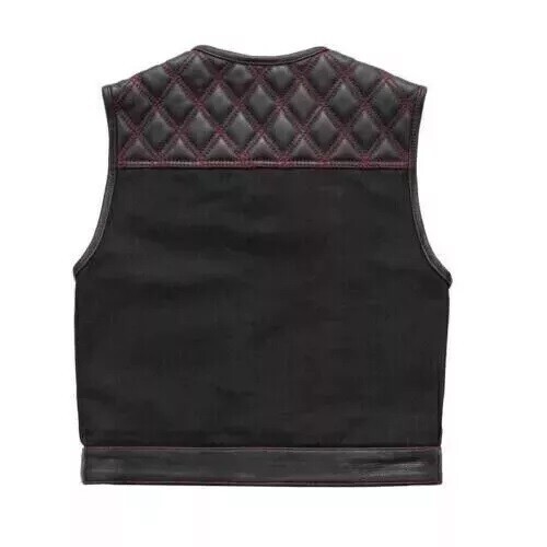 Men's Biker Vest Hunt Club Black Leather with Red Diamond Stitch and Red