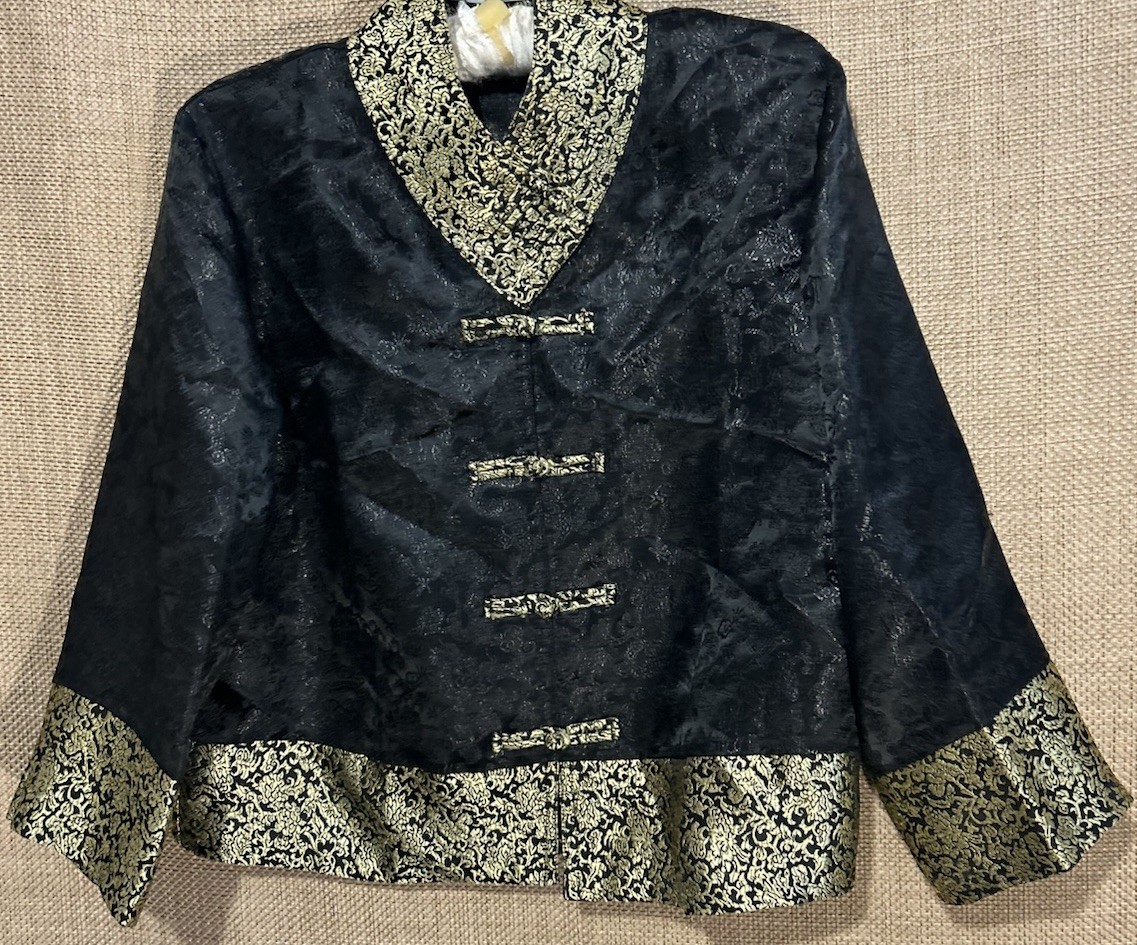 Vintage Asian Black Gold Brocade Jacquard Mandarin Jacket Blazer Women s Small