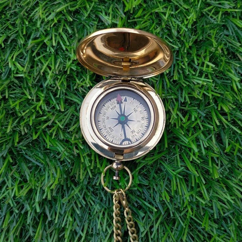 • Nautical Brass Push Button Compass with Leather Box - Perfect for Camping