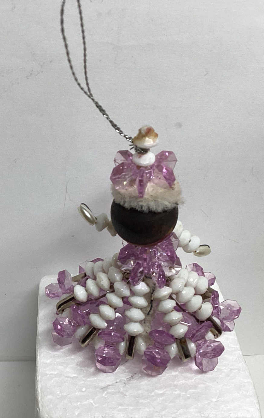 как выглядит Vintage 3" Safety-Pin Doll, Ornament Beaded Dress With Hat, Handmade Purple фото