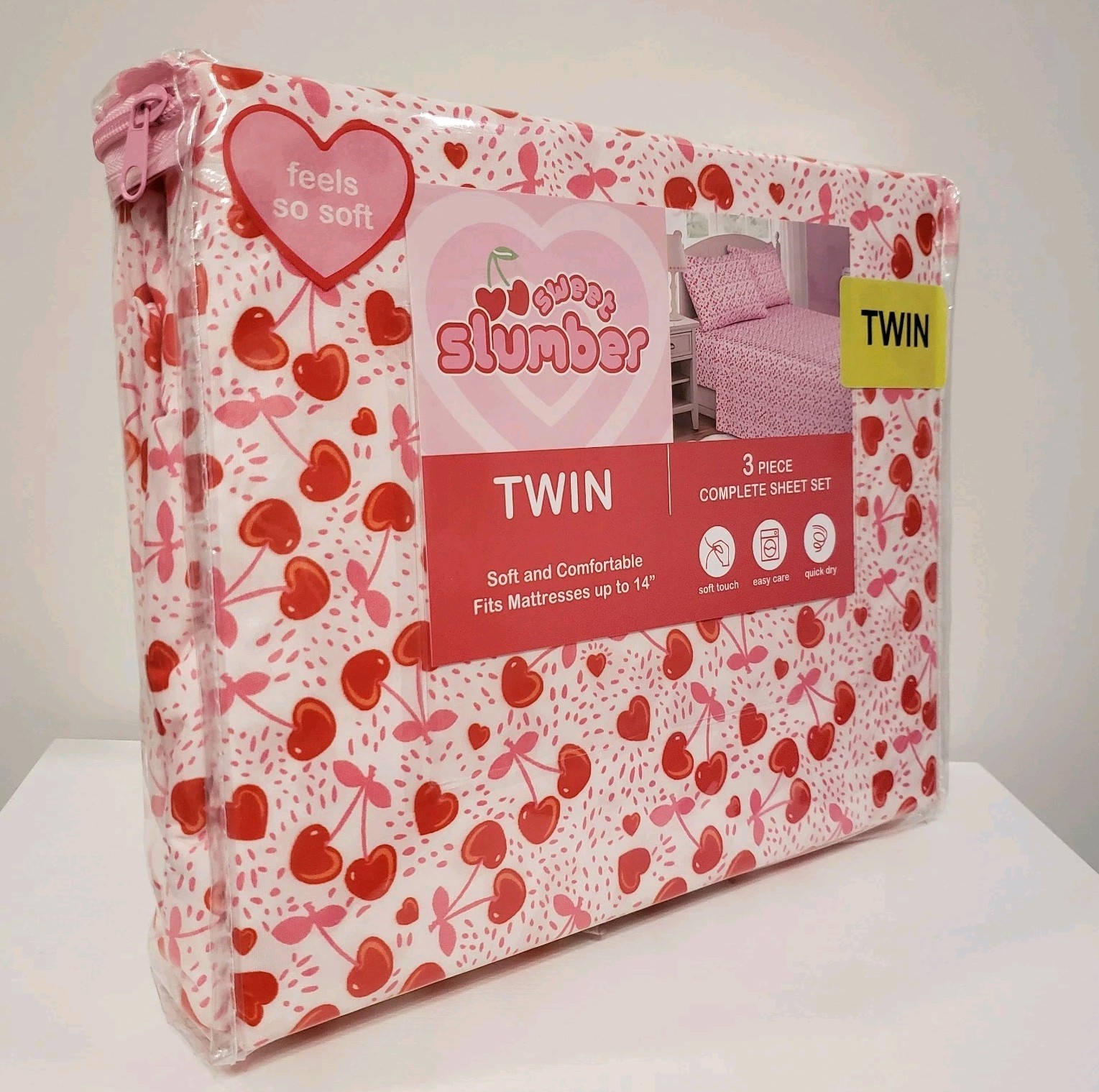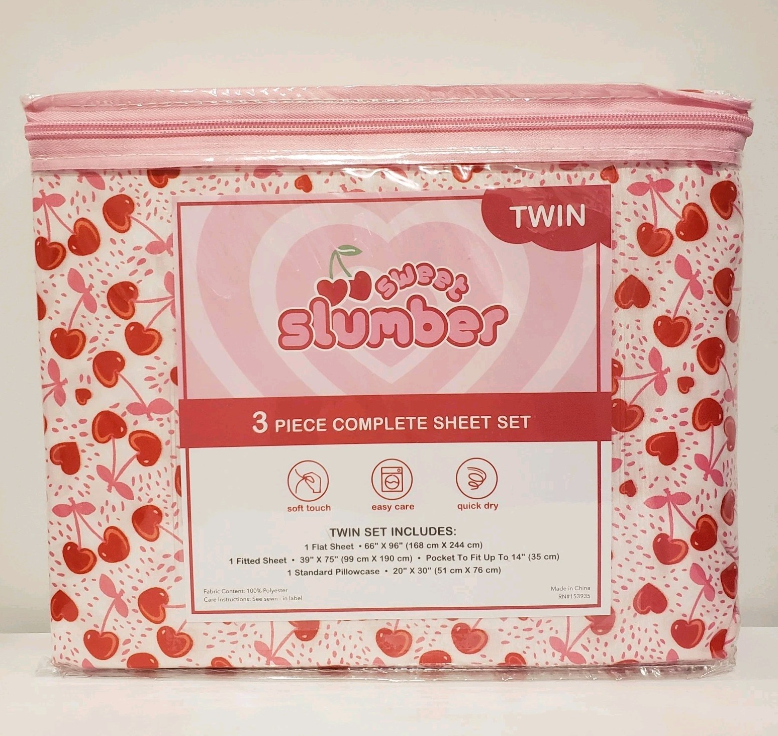 Twin Size Bed Sheet Set 3-Piece Cherries Hearts Red Spring Summer Coquette NEW