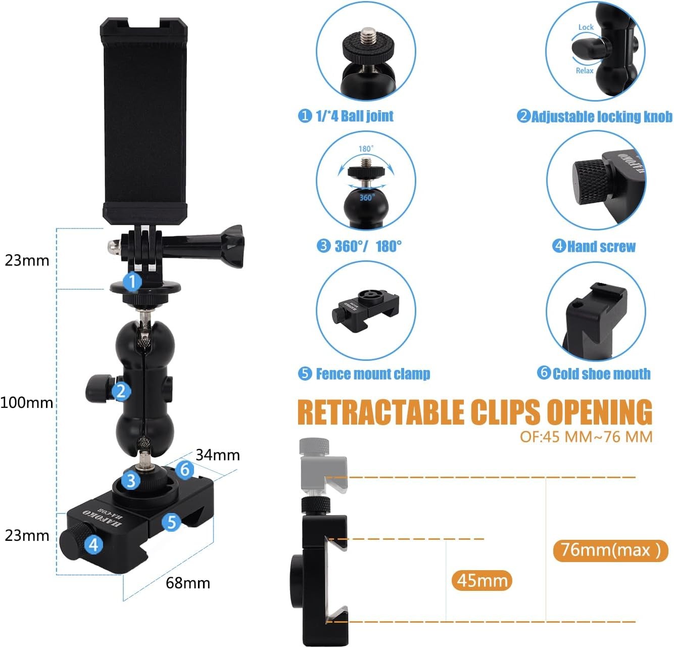 C08 Aluminum Smartphone Fence Mount Compatible for GoPro/Mevo Start/DJI Black