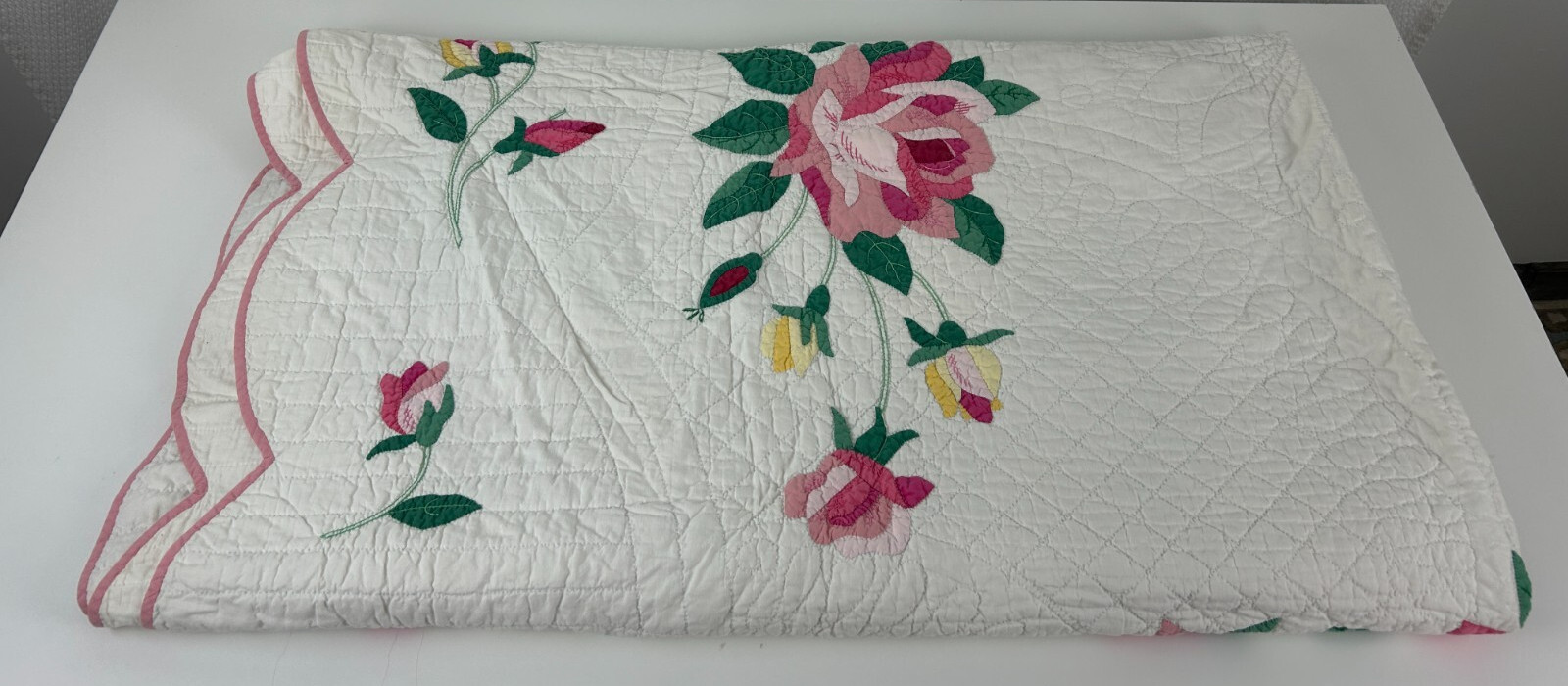 • Vintage Quilt Blanket Cottage Roses Floral 74"x84" Girls Bedding Twin AS IS