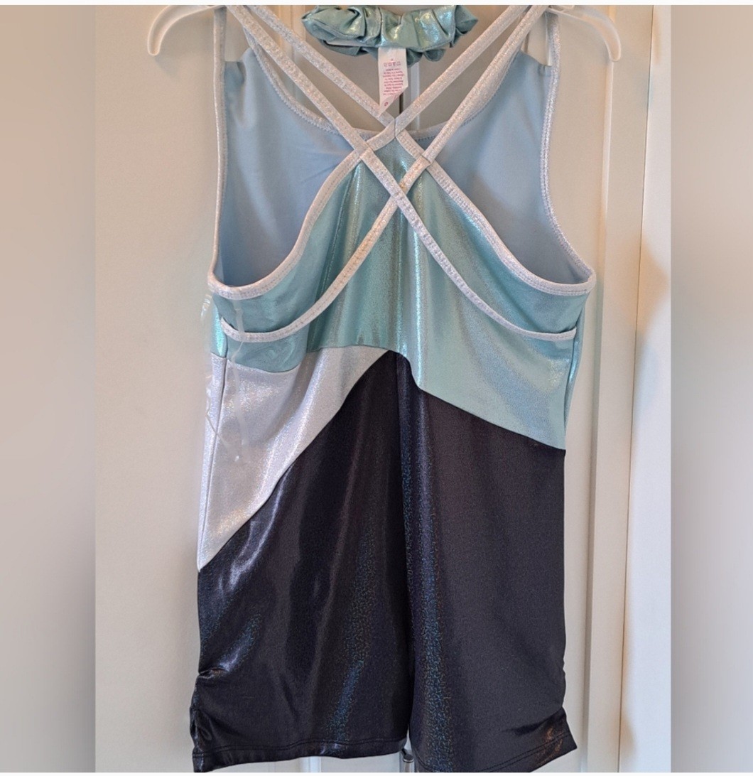 Justice Girl's Dance Gymnastics Blue/black Shinny Leotard W Scrunchie. Size L