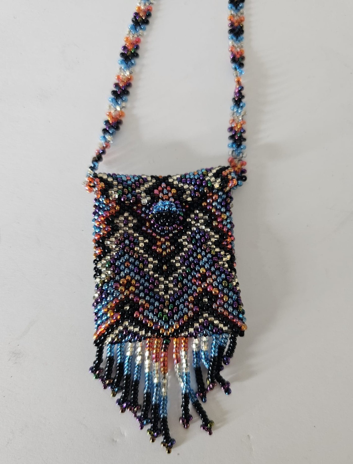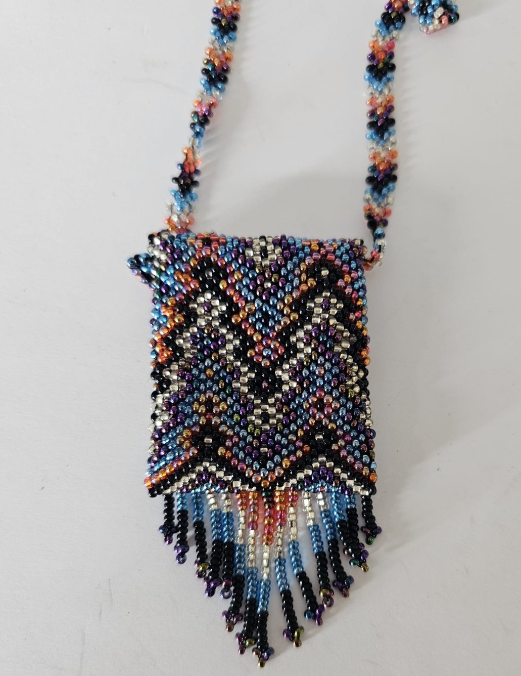 Vintage Handmade Zig Zag Glass Seed Bead Tiny Pouch Medicine Bag Tassel Necklace
