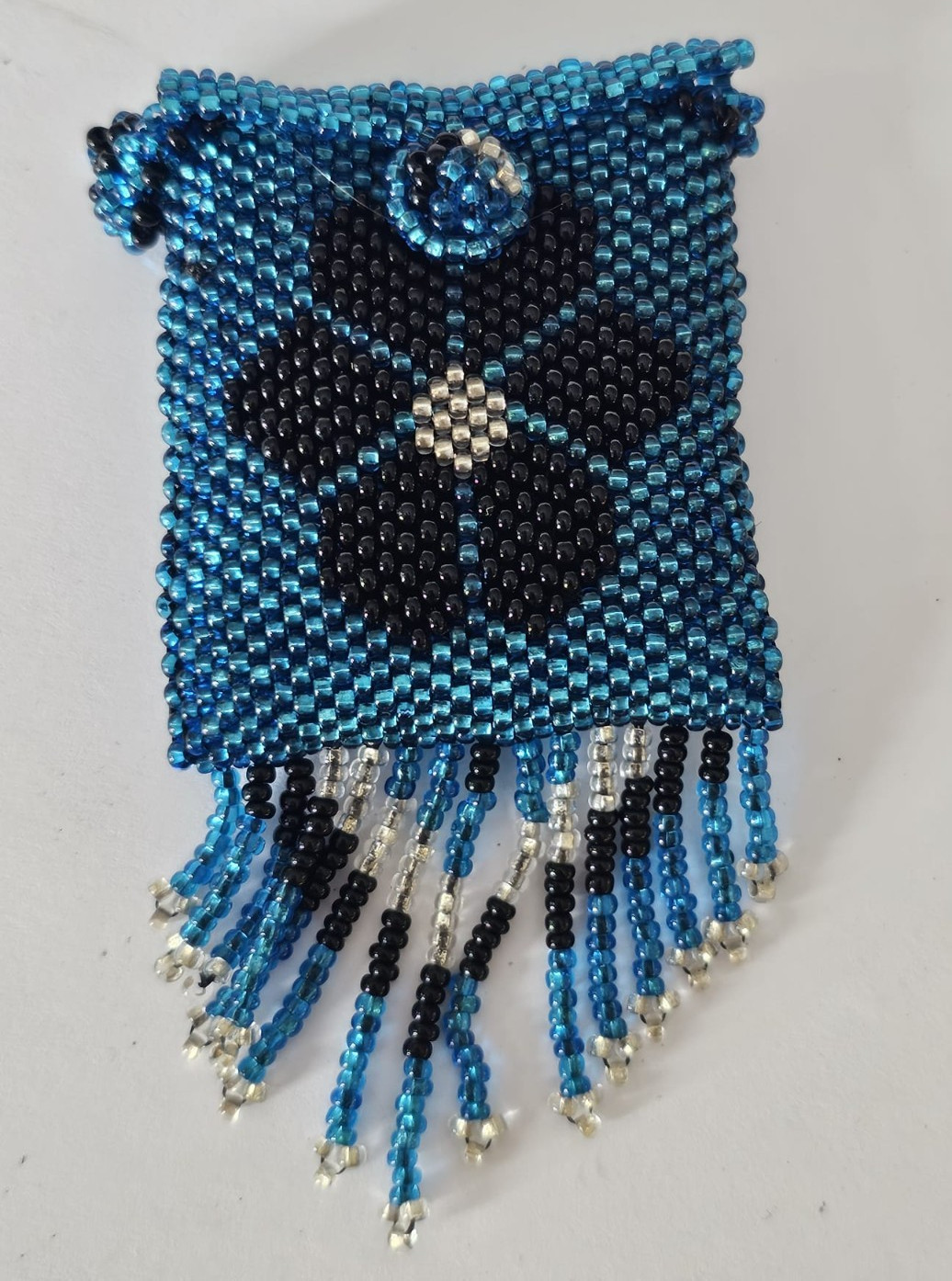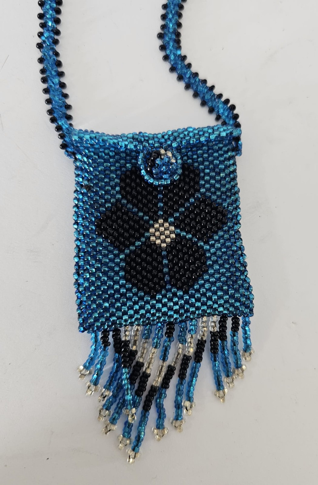 VTG Handmade Glass Bead Blue with Black Flower Tiny Pouch Medicine Bag Necklace