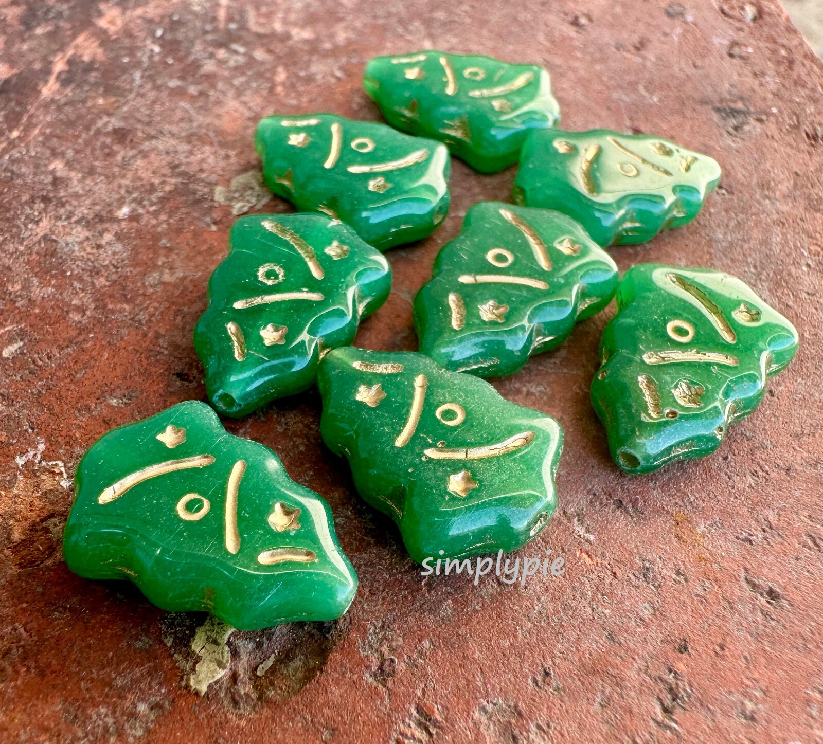 Green Gold Christmas Tree, Czech Glass Beads, 8 Pcs