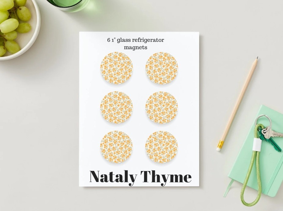 • 6- 1" Round Boho Minimalistic Yellow / Floral Gift Glass Refrigerator Magnets