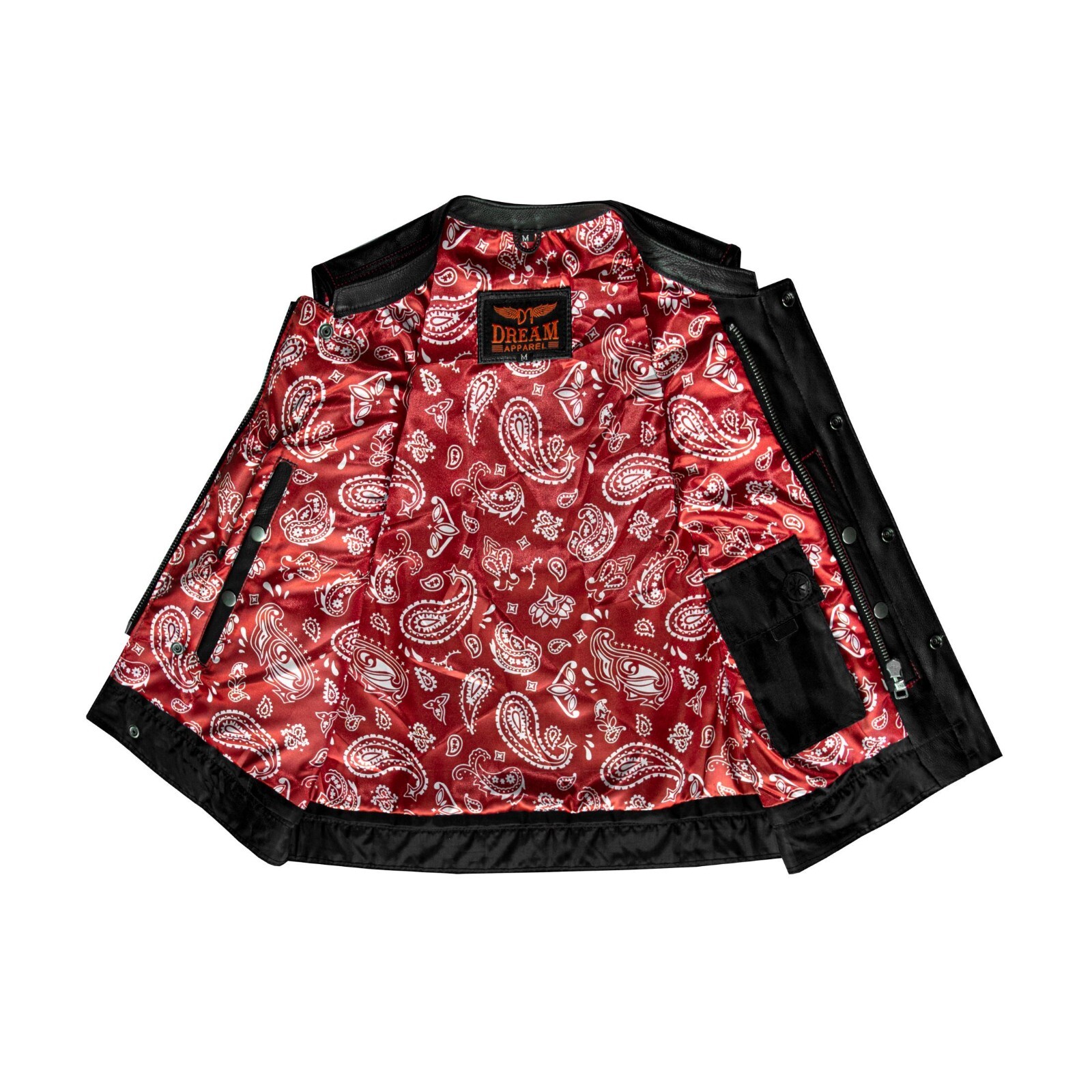 Men's Premium Black Cowhide Leather Motorcycle Red Paisley Lining Concealed Vest