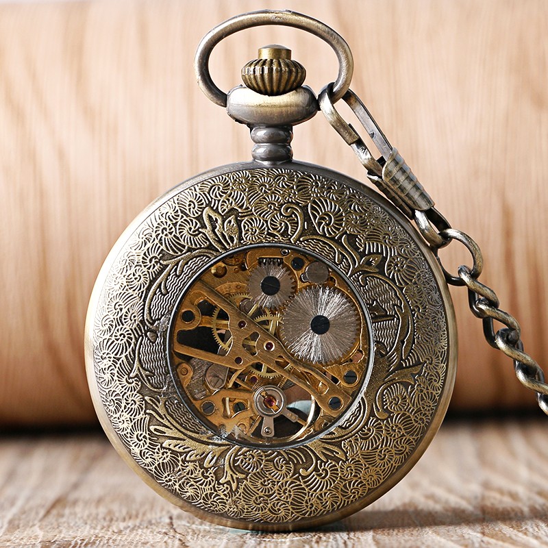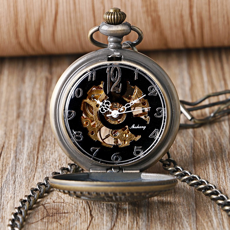 Vintage Hollow Dolphins Cover Women Men Hand Wind Mechanical Pocket Watch Chain