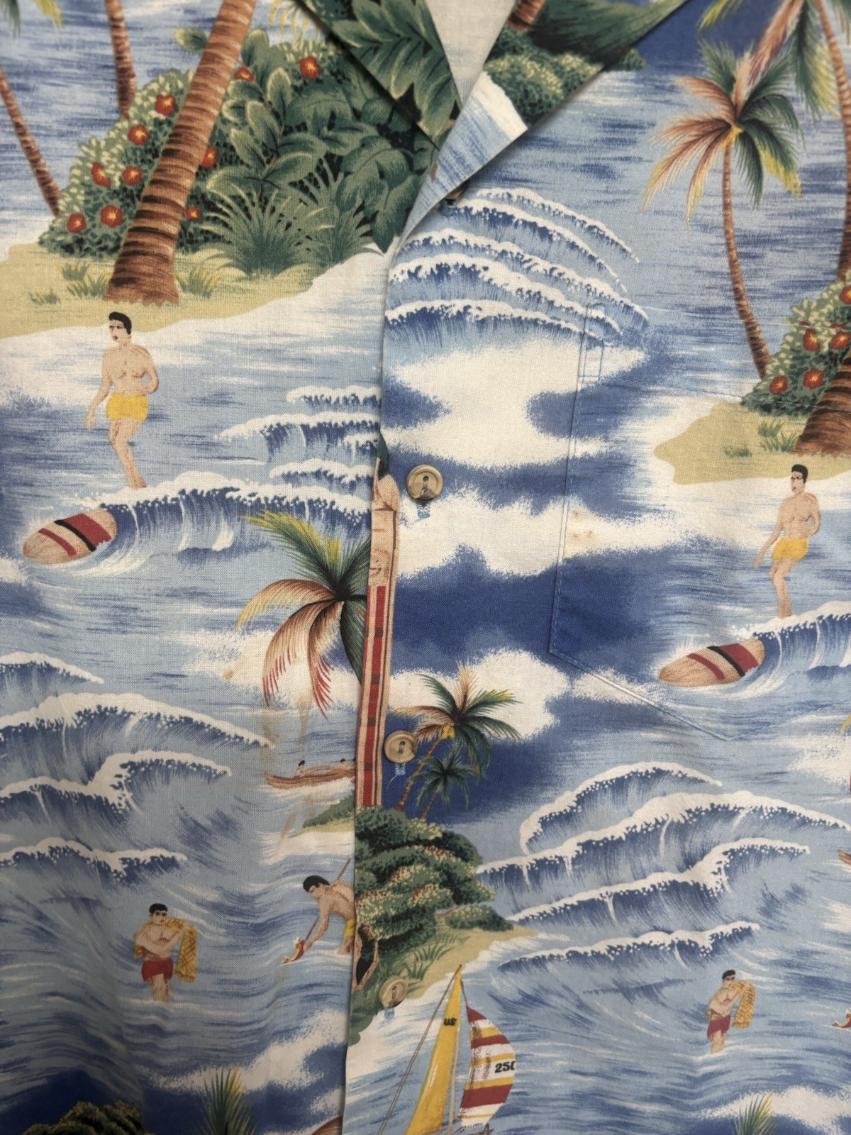 RJC Hawaiian Shirt Mens XL Made In HAWAII Boats, Palms, Surfboards Beach Pre-Own