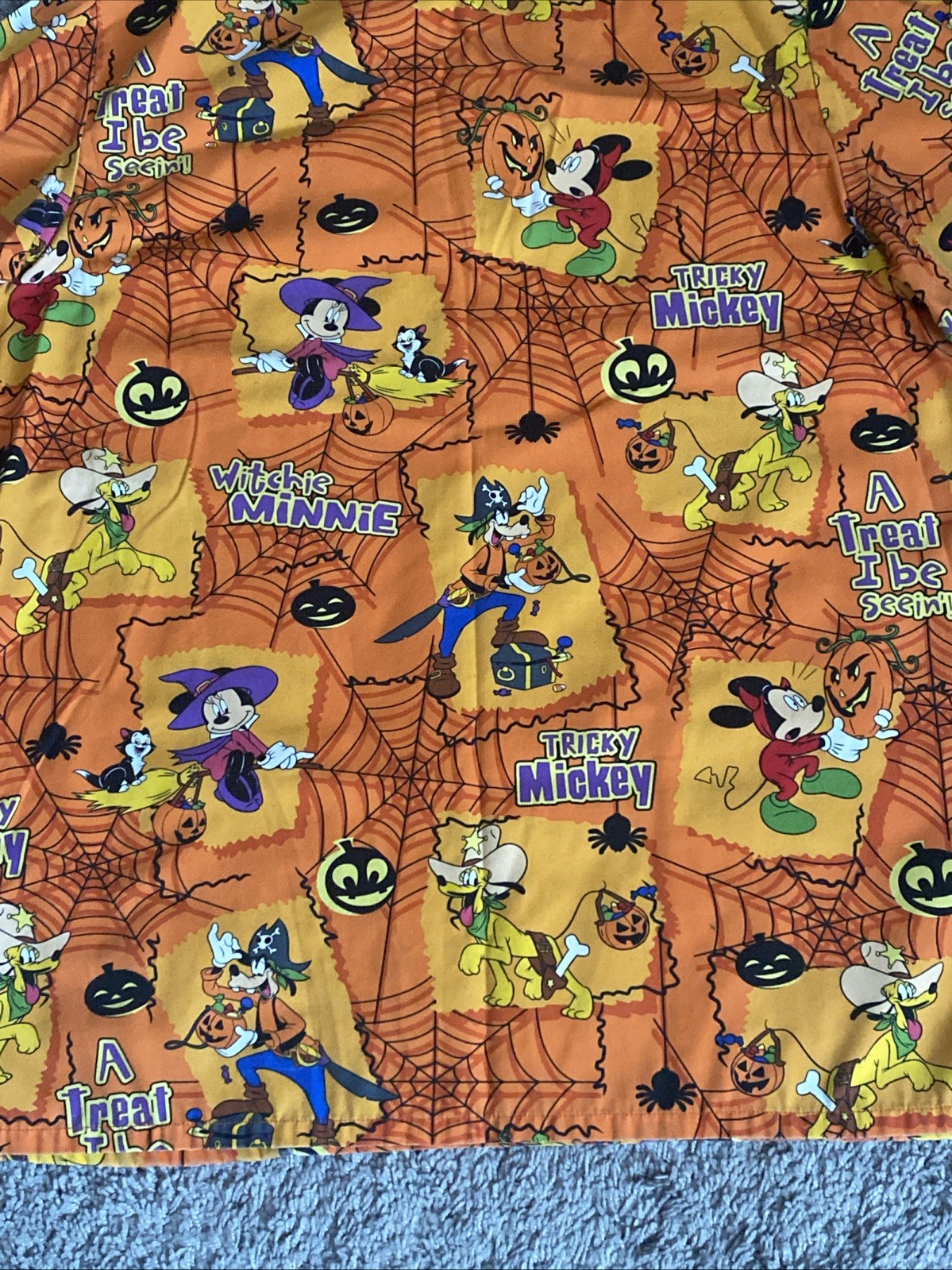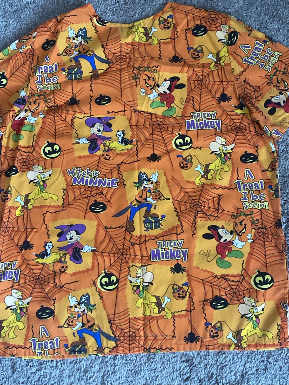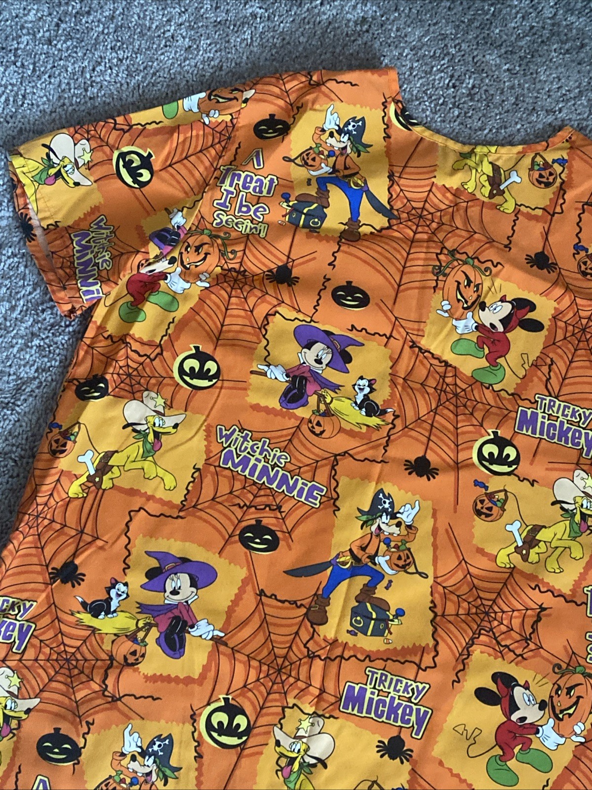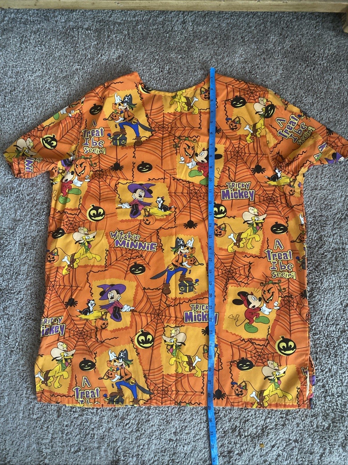 Tricky Mickey Witchy Minnie Mouse Halloween Disney Womens Scrub Top Orange Sz M