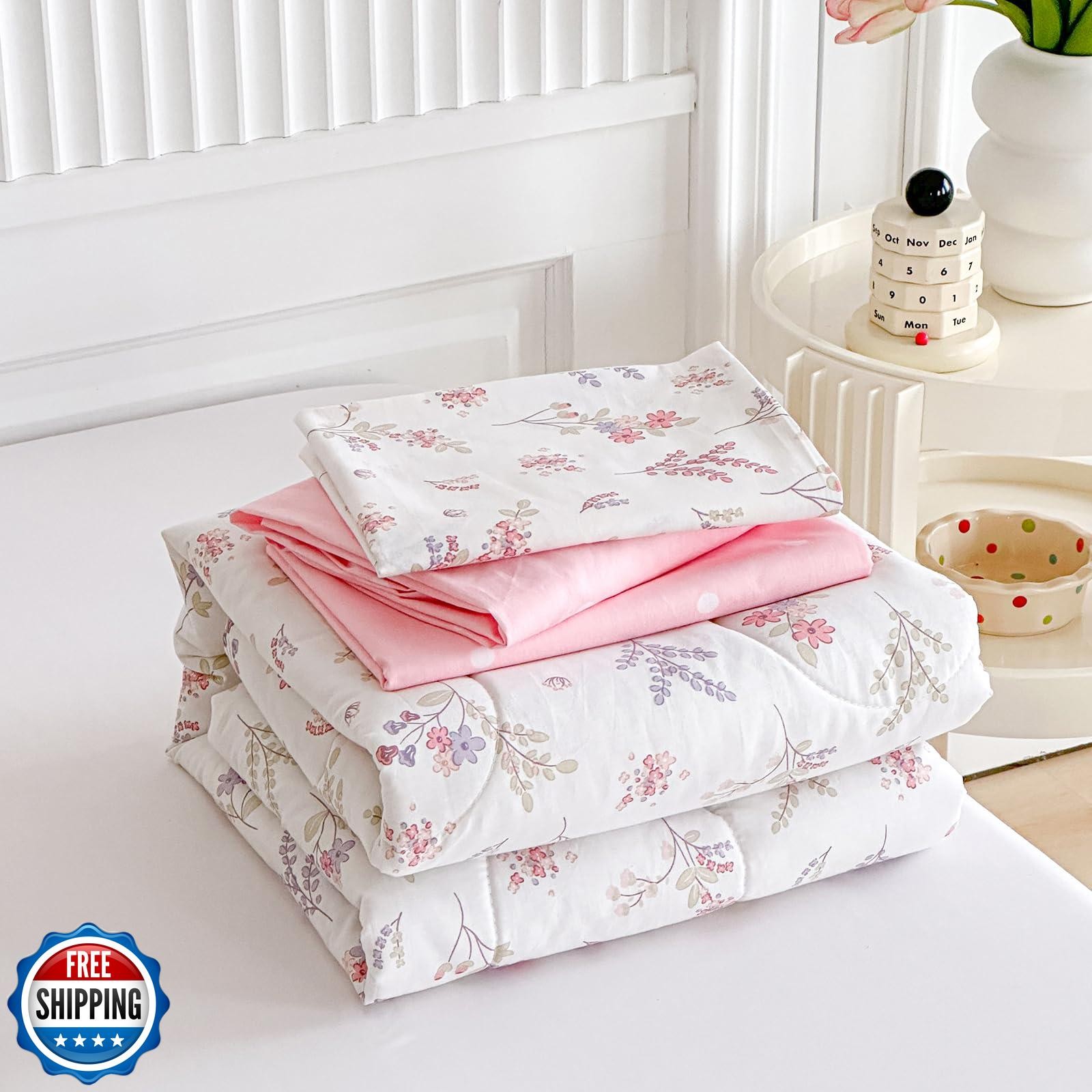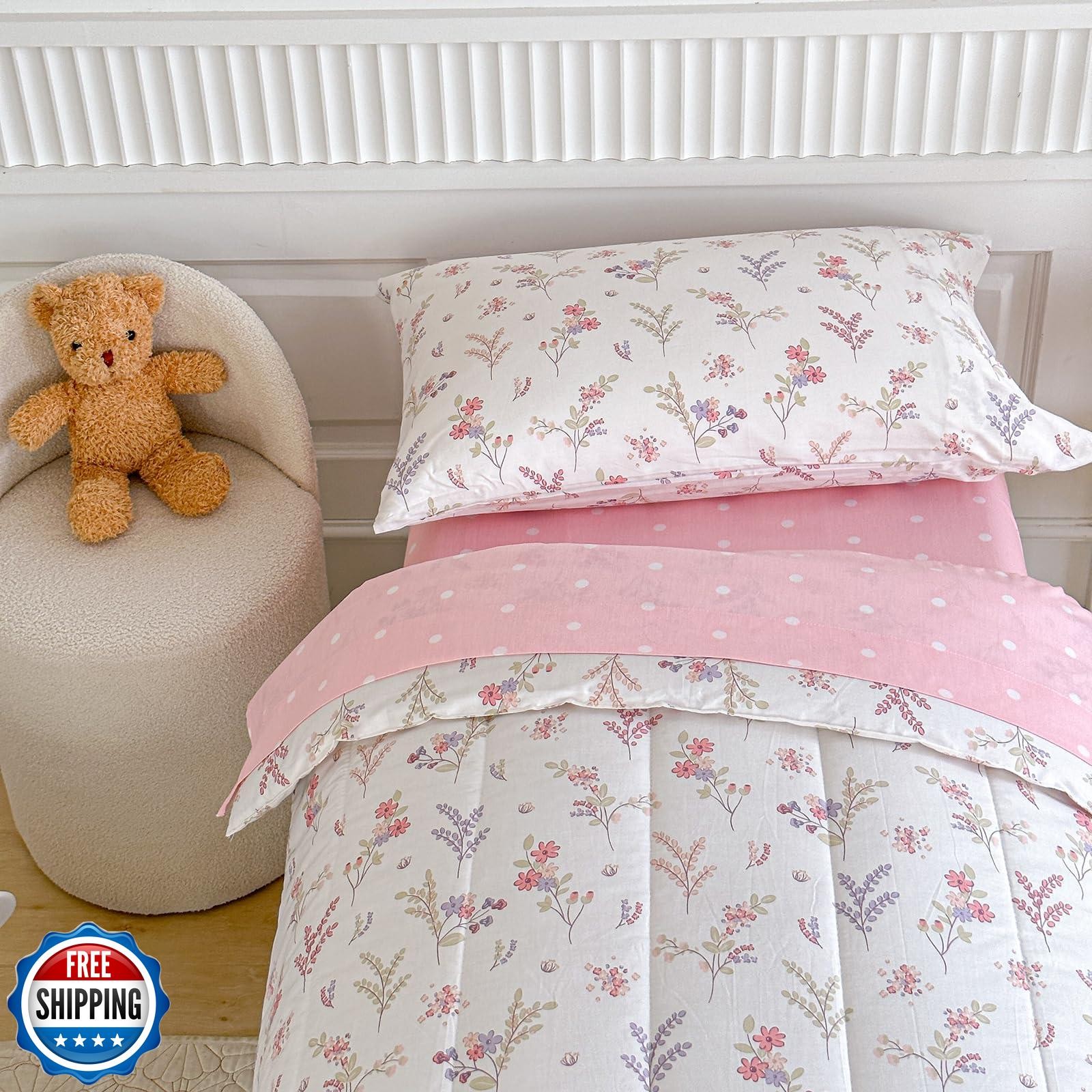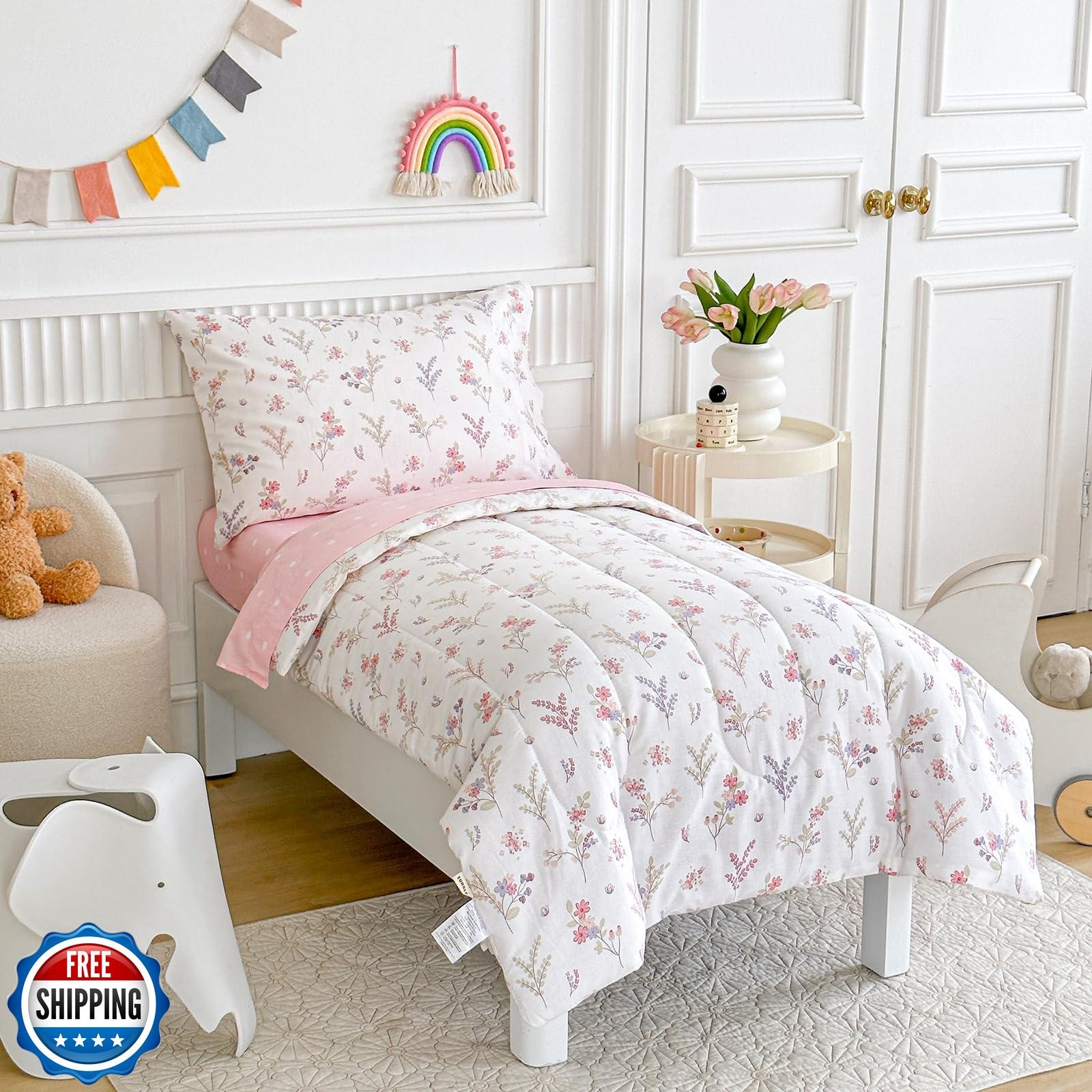 Joyreap 4 Piece Cotton Toddler Bedding Set for Girls, Flowers n Leaves Pink D